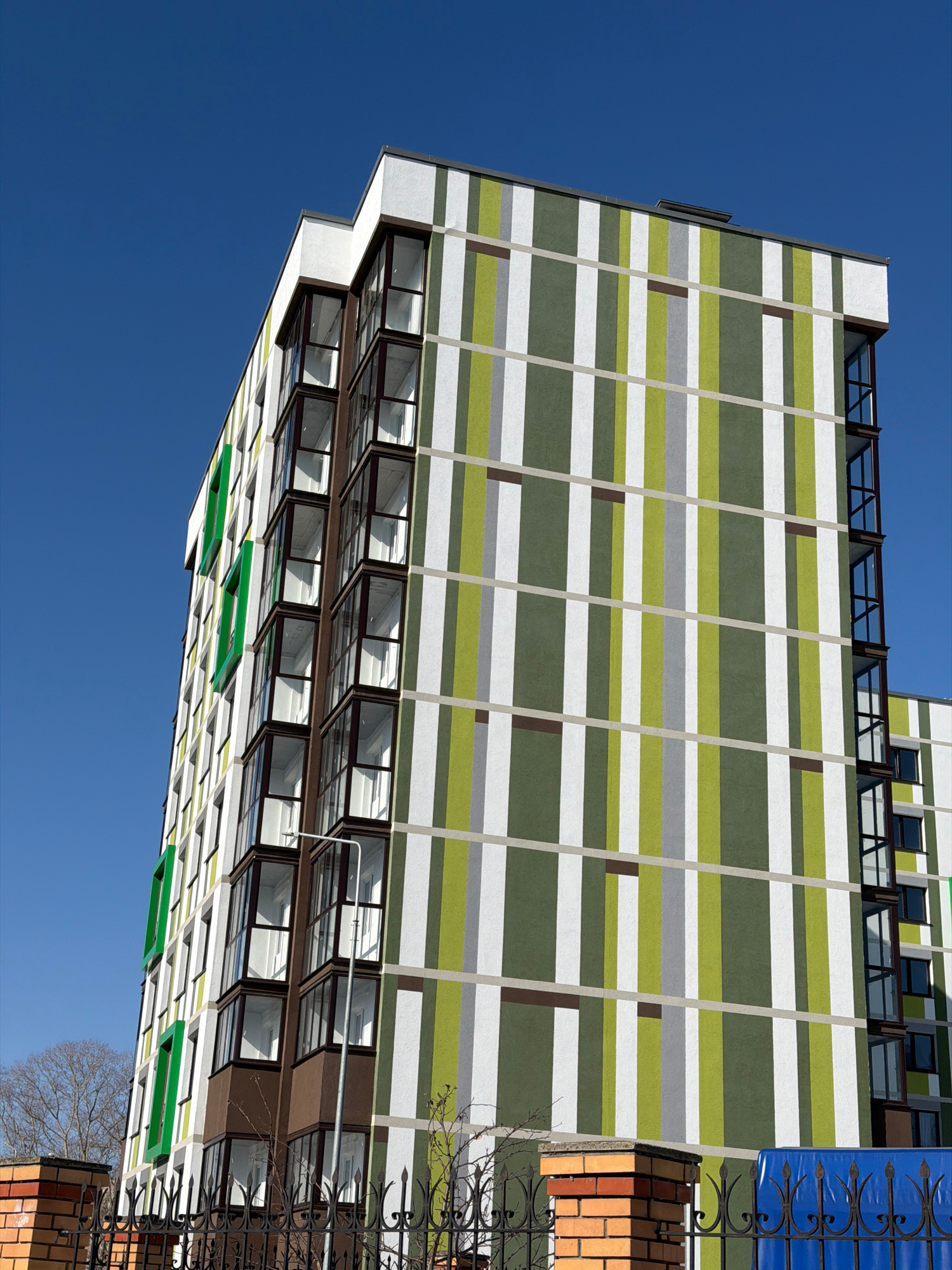 An upward-angled shot reveals a modern apartment building under a clear, blue sky in Berezniki, Russia. The building's facade features a distinctive, patterned design of horizontal stripes in alternat…read more