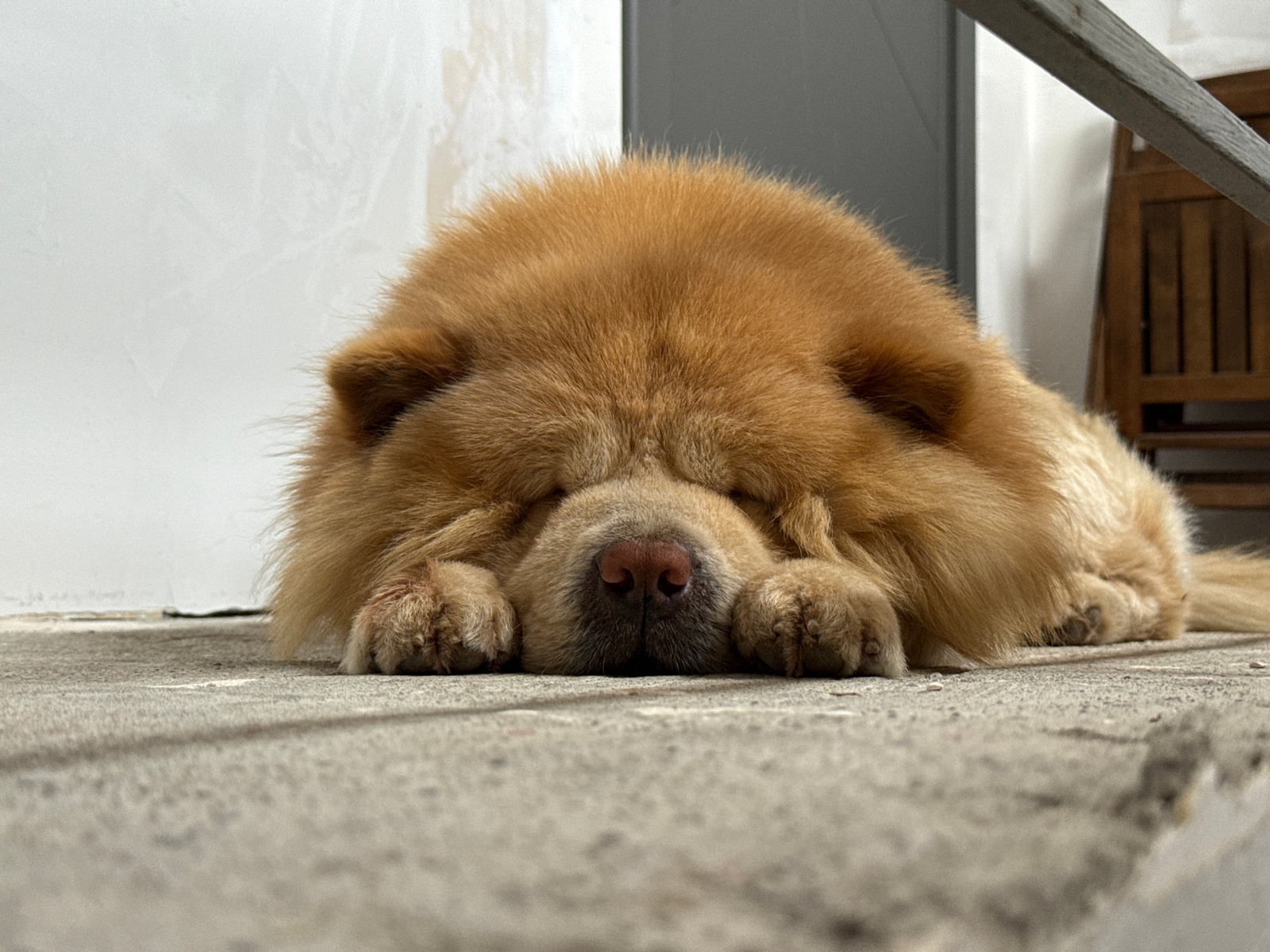 A close-up, low-angle shot depicts a golden-brown Chow Chow dog asleep on a gray concrete surface. The dog's head rests on its paws, with its nose close to the ground. The fur is thick and fluffy, obs…read more