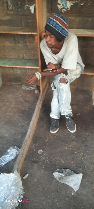 This image captures a young man in what appears to be a dilapidated or unfinished indoor setting. The man, with dark skin and a short beard, is wearing a patterned blue, red, and black beanie, a light…read more