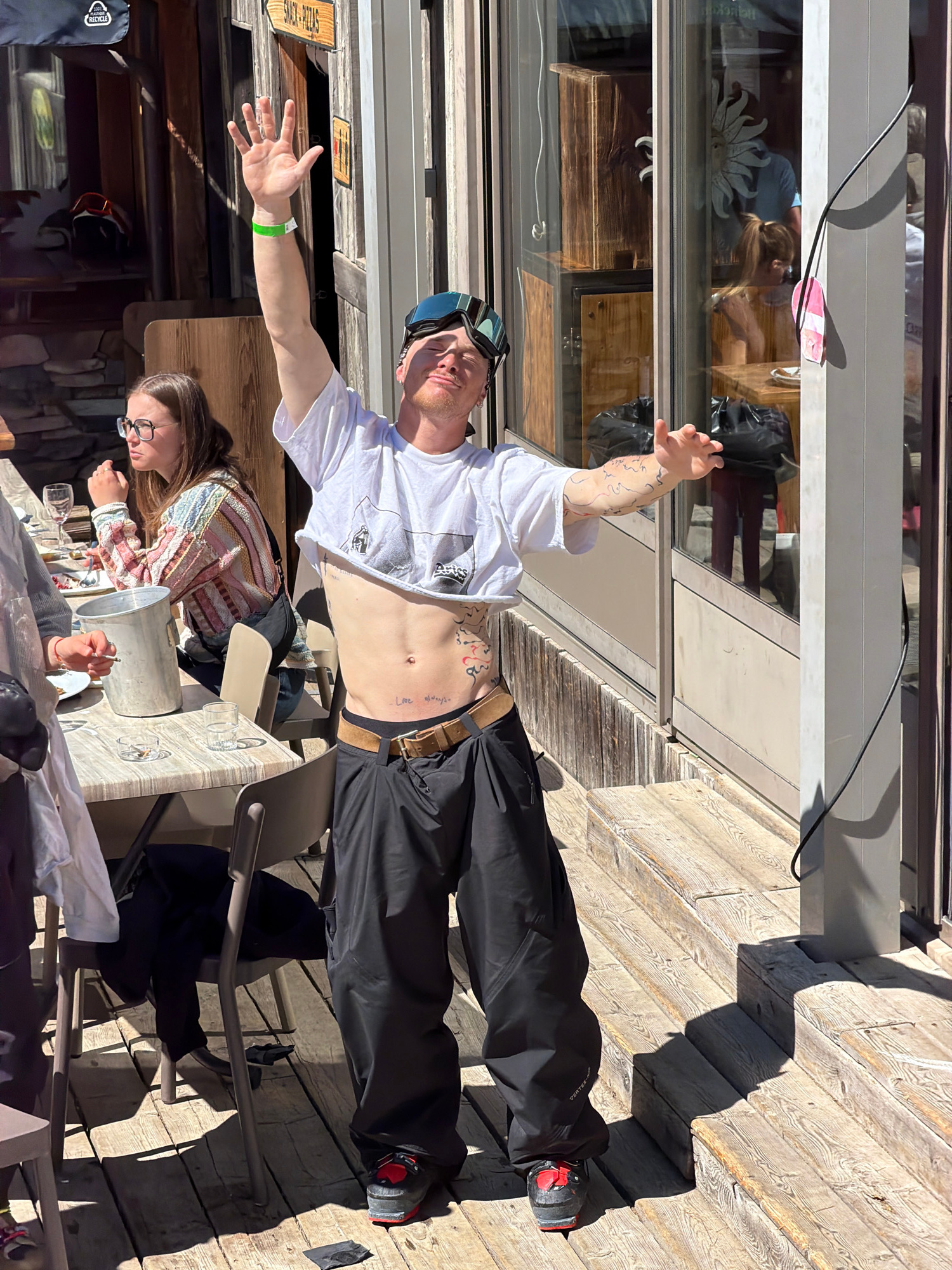 On a sunny day in Saint-Chaffrey, France, an outdoor scene unfolds. A man, shirtless with ski goggles on his head and wearing black ski pants, lies across a wooden deck, posing with outstretched arms.…read more