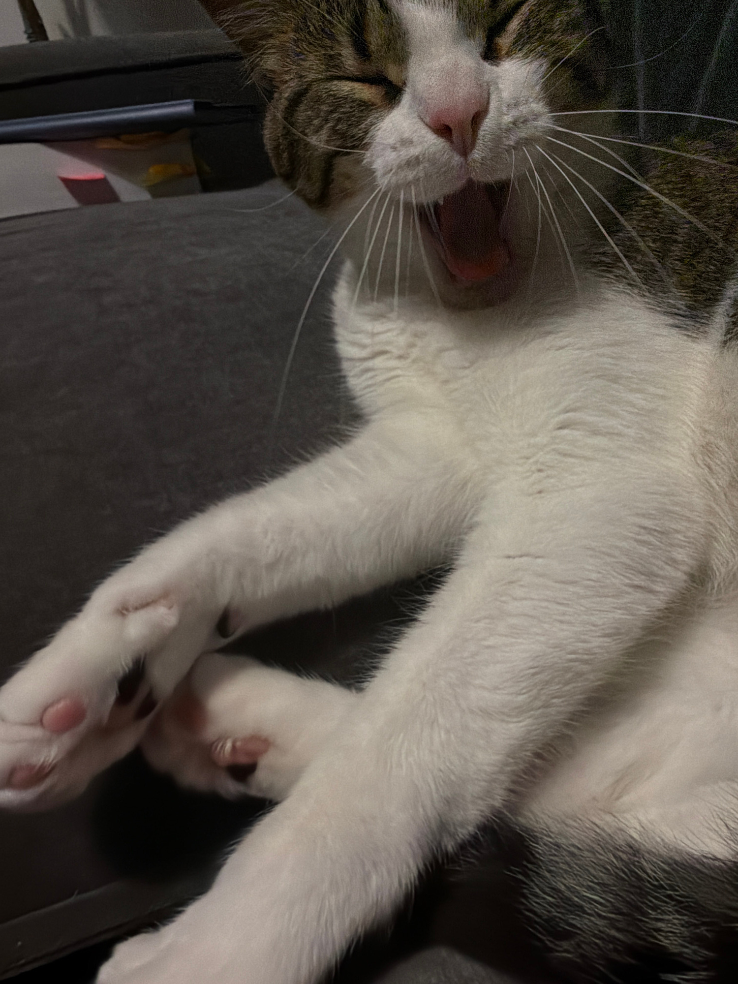 A close-up, slightly tilted shot depicts a tabby and white cat lying on a gray surface, possibly a couch or cushion. The cat's head, with its brown tabby markings on the forehead and closed eyes, is p…read more