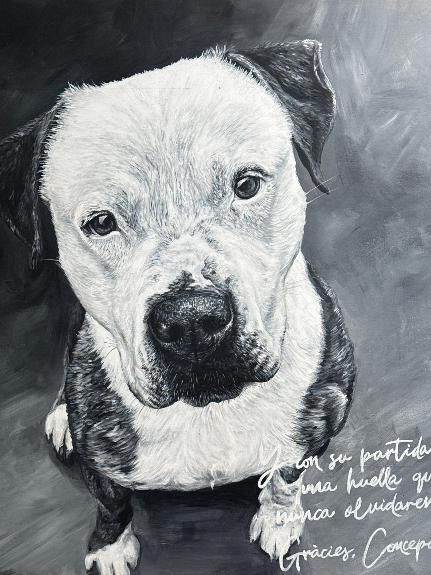 The media file presents a monochrome (black and white) painting of a dog, likely a Pit Bull or Staffordshire Bull Terrier, depicted from an overhead perspective. The dog's head is slightly tilted, and…read more
