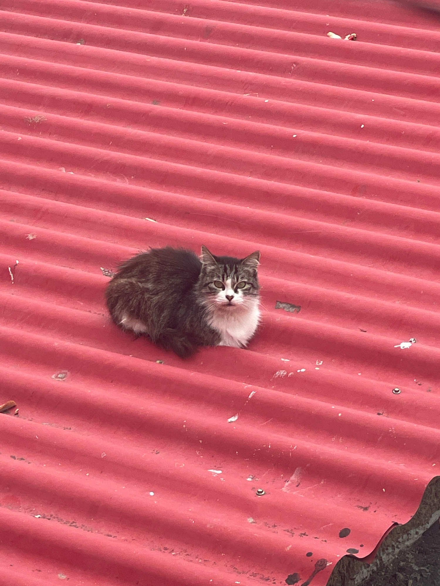 An overhead medium shot features a domestic cat resting on a red corrugated metal roof. The cat is bi-color, predominantly dark tabby with grey-brown stripes on its back and sides, contrasting with wh…read more