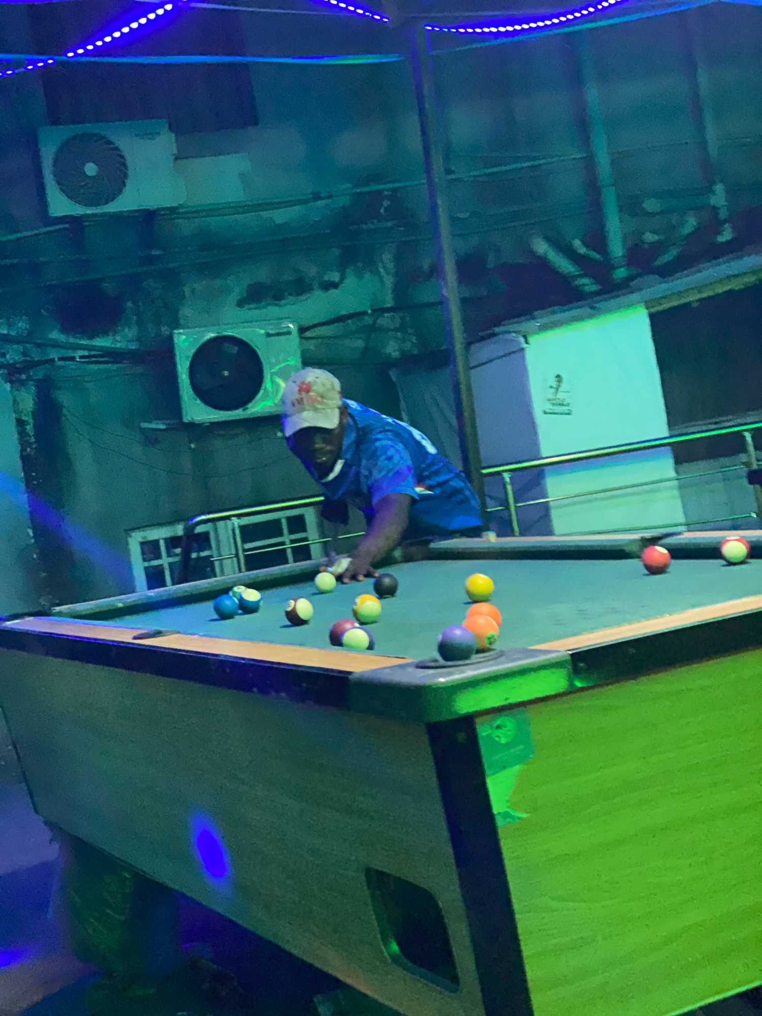 The image depicts a man playing pool inside a building, likely in a recreational establishment. The location is Ado, Nigeria. **People:** One adult male is visible, wearing a blue patterned shirt and…read more