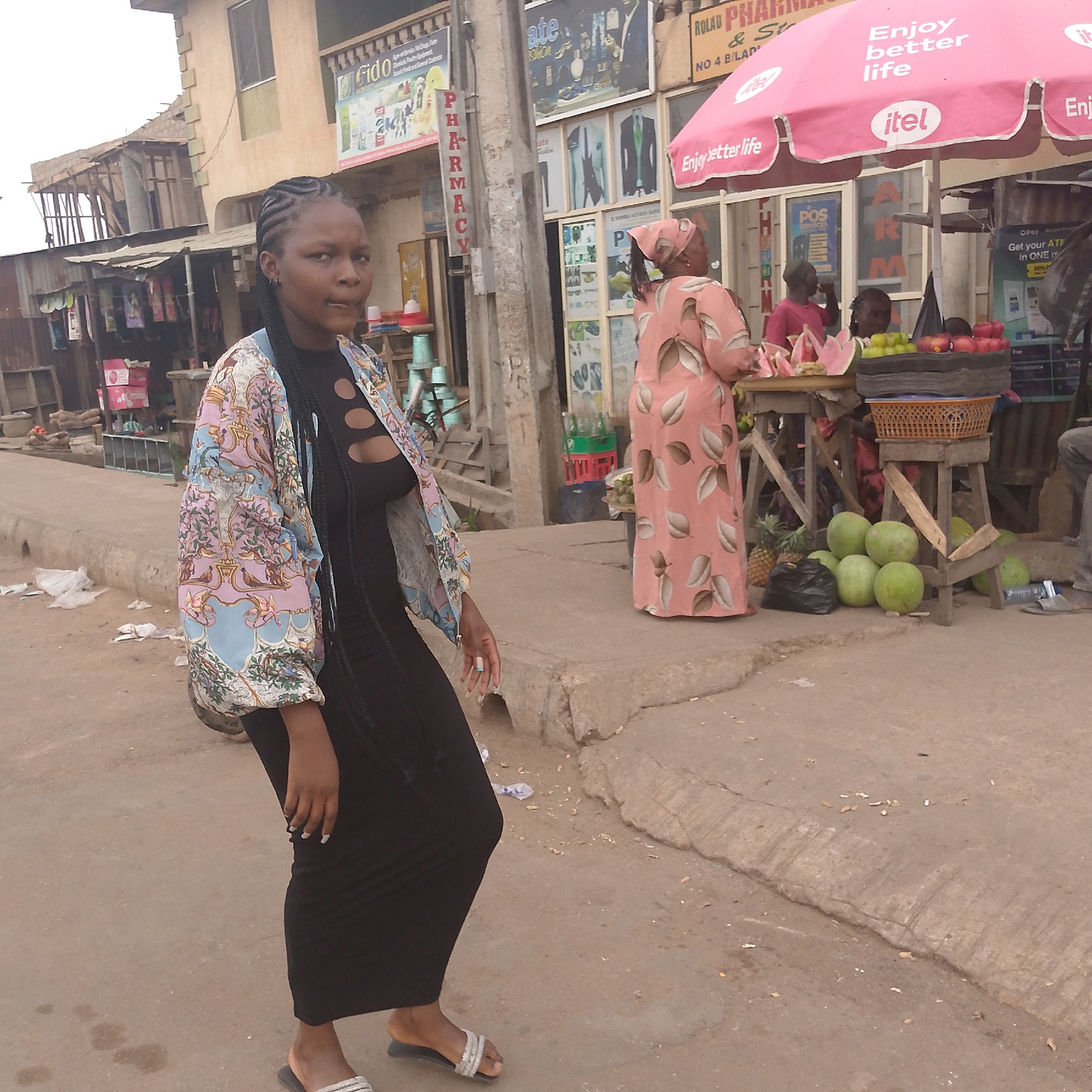 The image shows a woman in a black dress and patterned jacket standing on a street in Bukuru, Nigeria. Behind her is a building with a "Fido Pharmacy" sign. To the right, a woman in a long, patterned…read more