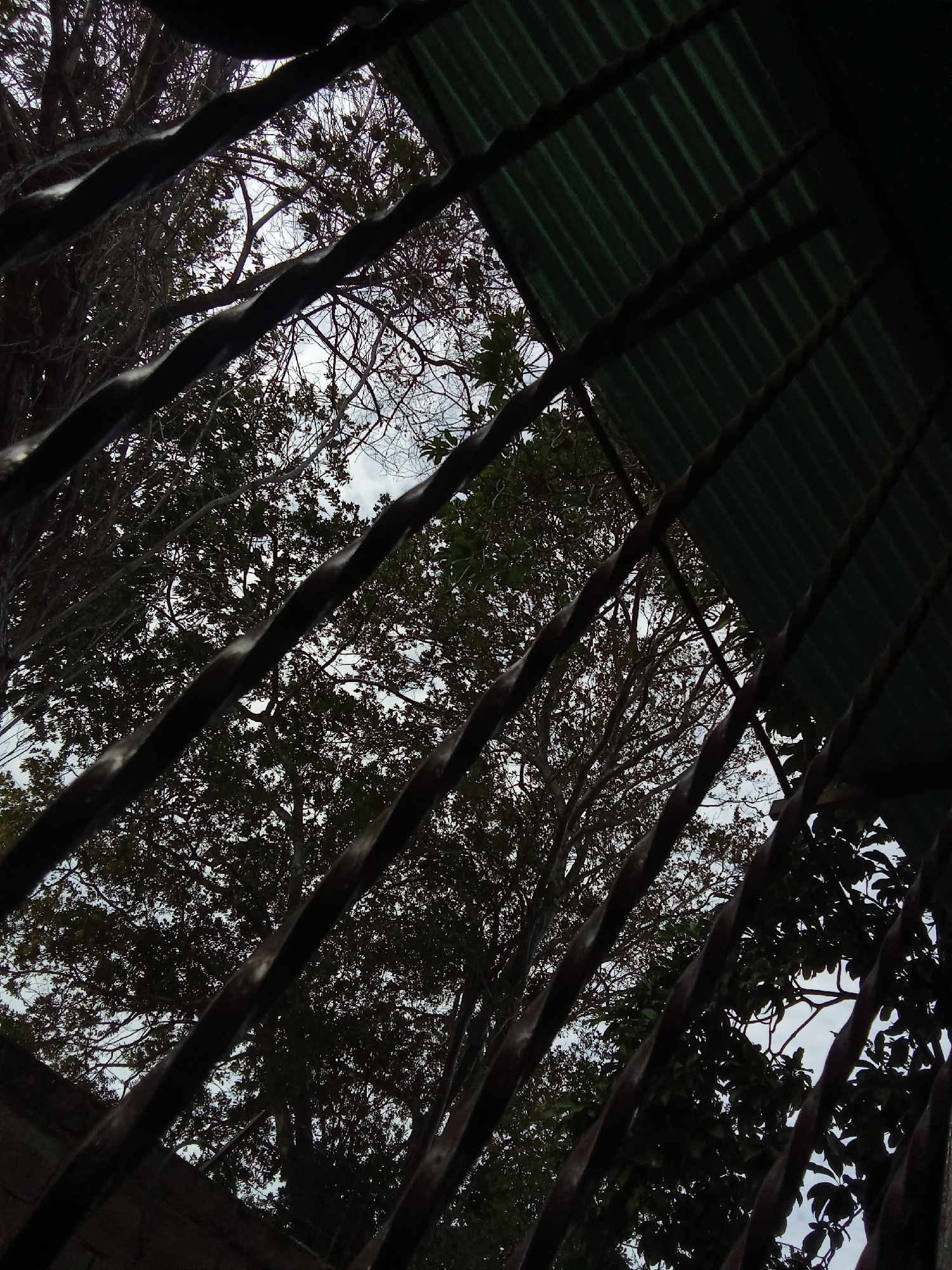 A low-angle shot from behind an iron grate or bars, possibly a window or balcony, reveals the sky and trees. The trees are silhouetted against a cloudy sky. Part of a green corrugated roof or awning i…read more