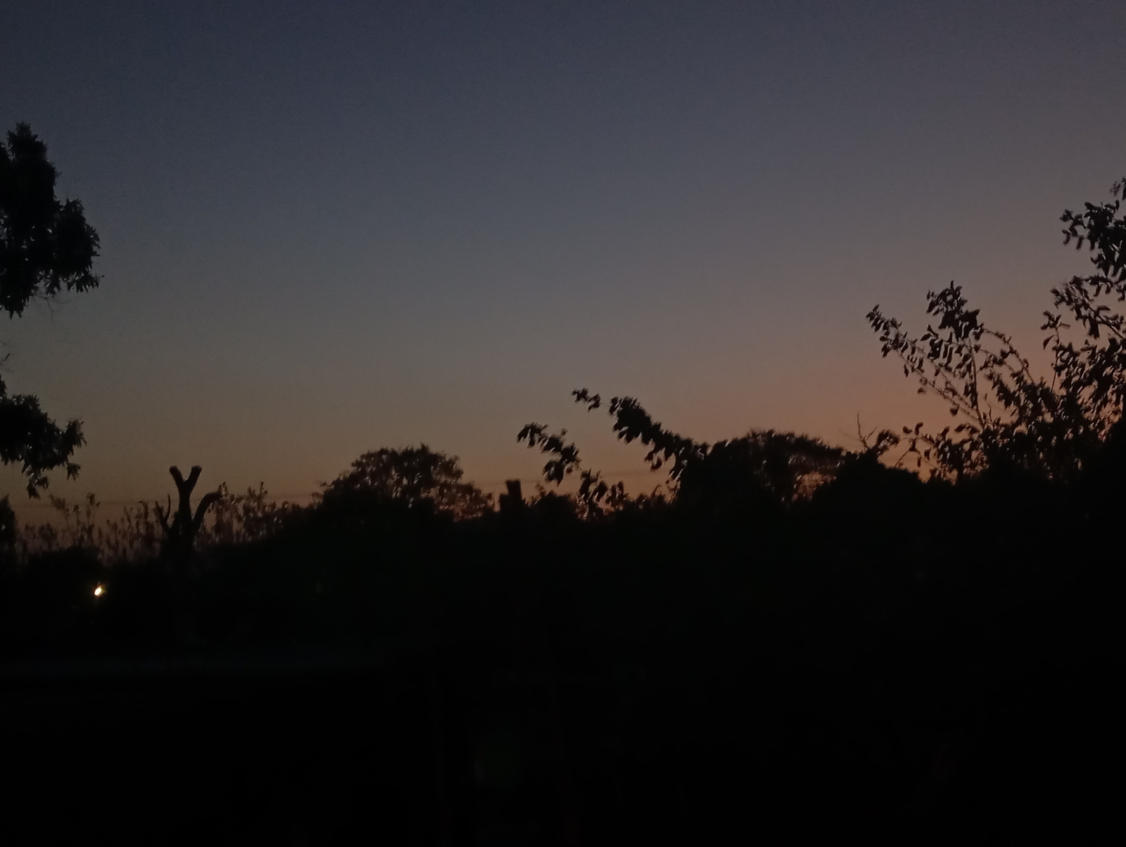 The image depicts a dark, possibly nighttime, scene with silhouettes of trees against a twilight sky. The sky transitions from a deep blue/purple at the top to a faint orange glow near the horizon. Th…read more