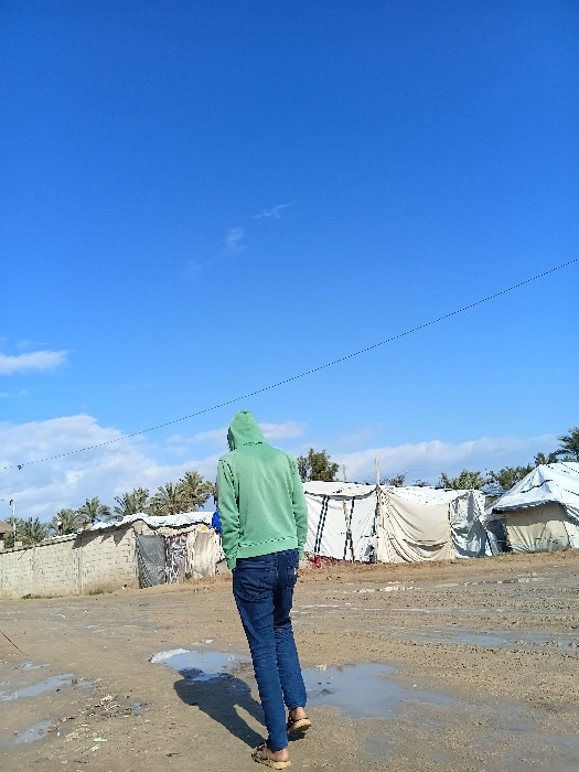 A person in a green hoodie and jeans stands on a muddy ground near several tents and brick structures. The person's back is to the camera, obscuring their face. The ground appears wet with puddles. Inβ¦read more