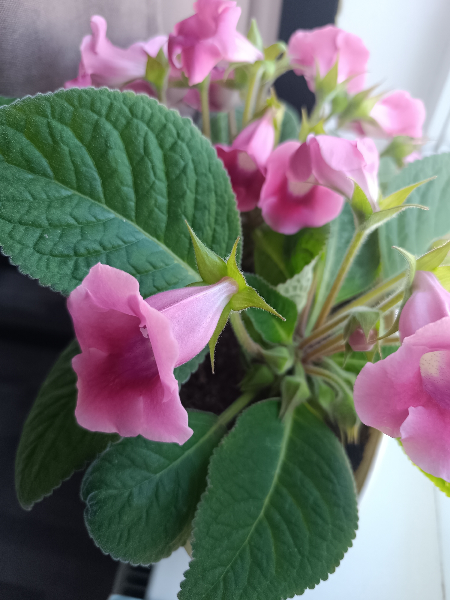 The image shows a flowering Gloxinia plant, with several open, pink, bell-shaped flowers and numerous large, textured green leaves. The plant is potted and positioned near a window, as suggested by th…read more