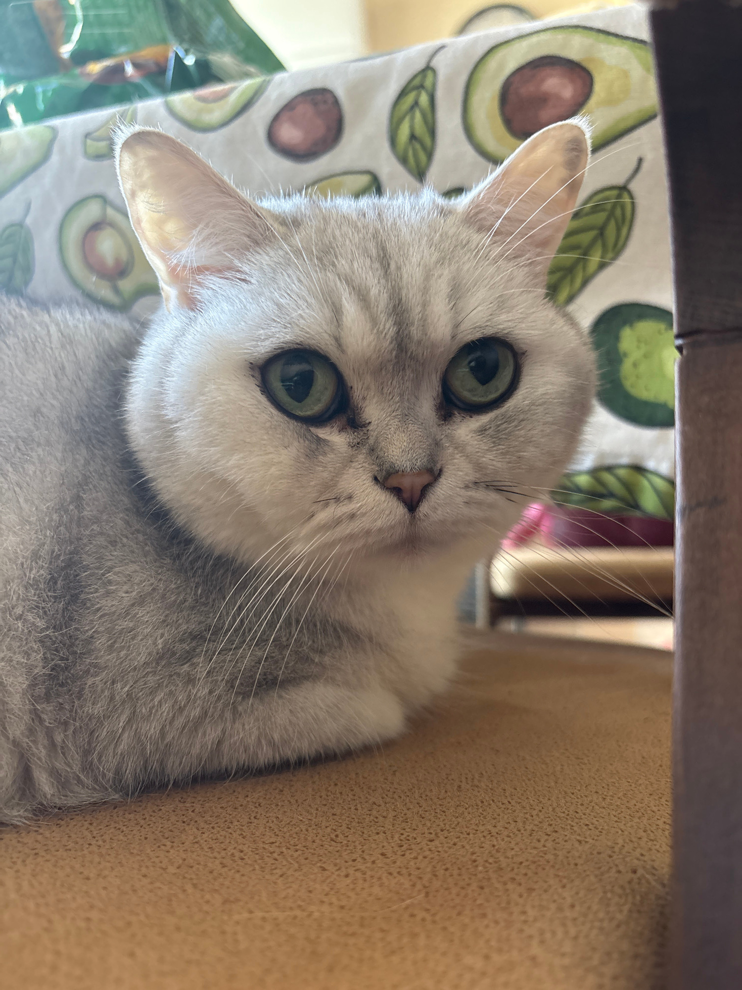 A grey-and-white cat with green eyes looks directly at the viewer. The cat is resting on a cushion with an avocado print. Above the cushion is a dark wooden surface. To the cat's right is a beige vertβ¦read more
