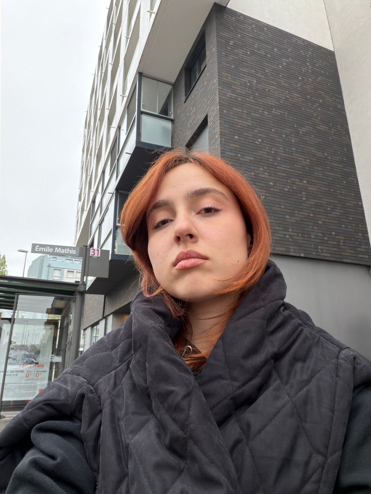 A young woman with auburn hair is facing the camera. She is wearing a black quilted jacket. Behind her is a building with a grey brick facade. In the foreground is a street sign that reads "Émile Math…read more