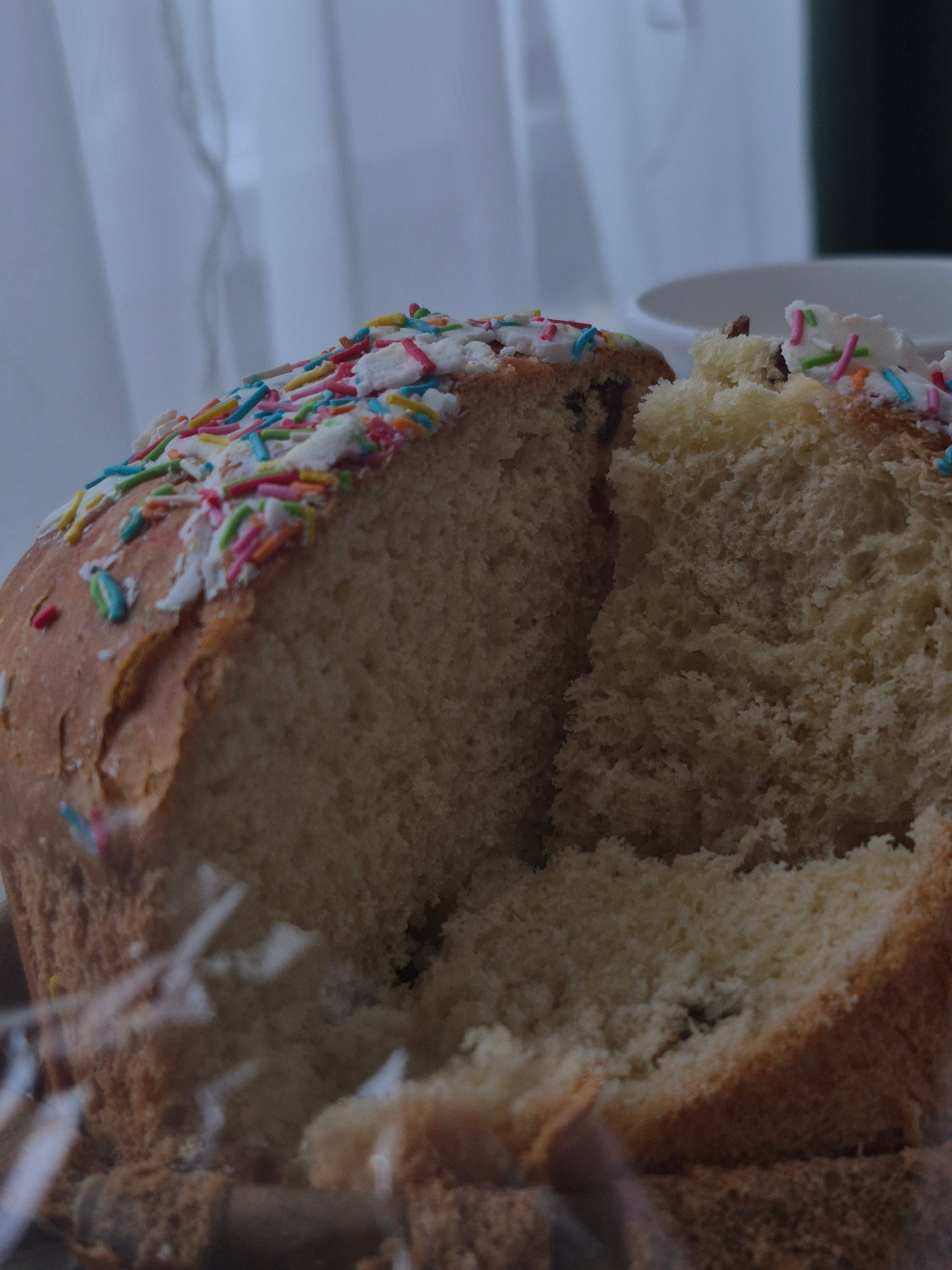 A close-up shot shows a section of kulich, a Russian Easter bread, decorated with white icing and colorful sprinkles. The bread has a dense, spongy texture and appears to be freshly cut. The backgroun…read more