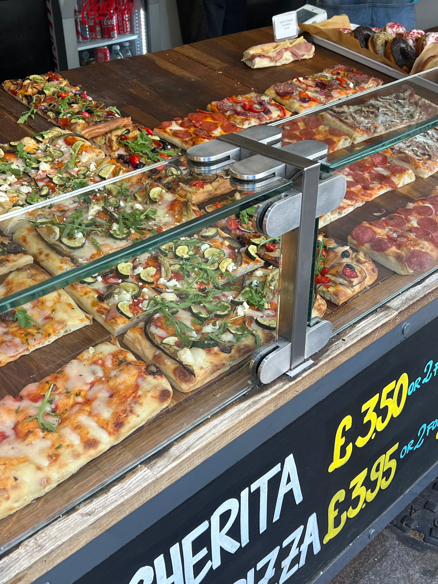 The image shows a display case filled with various types of pizza slices and sandwiches, with a sign that reads "PIZZA MARITA £3.50 or £3.95." The pizza slices have different toppings, including peppe…read more