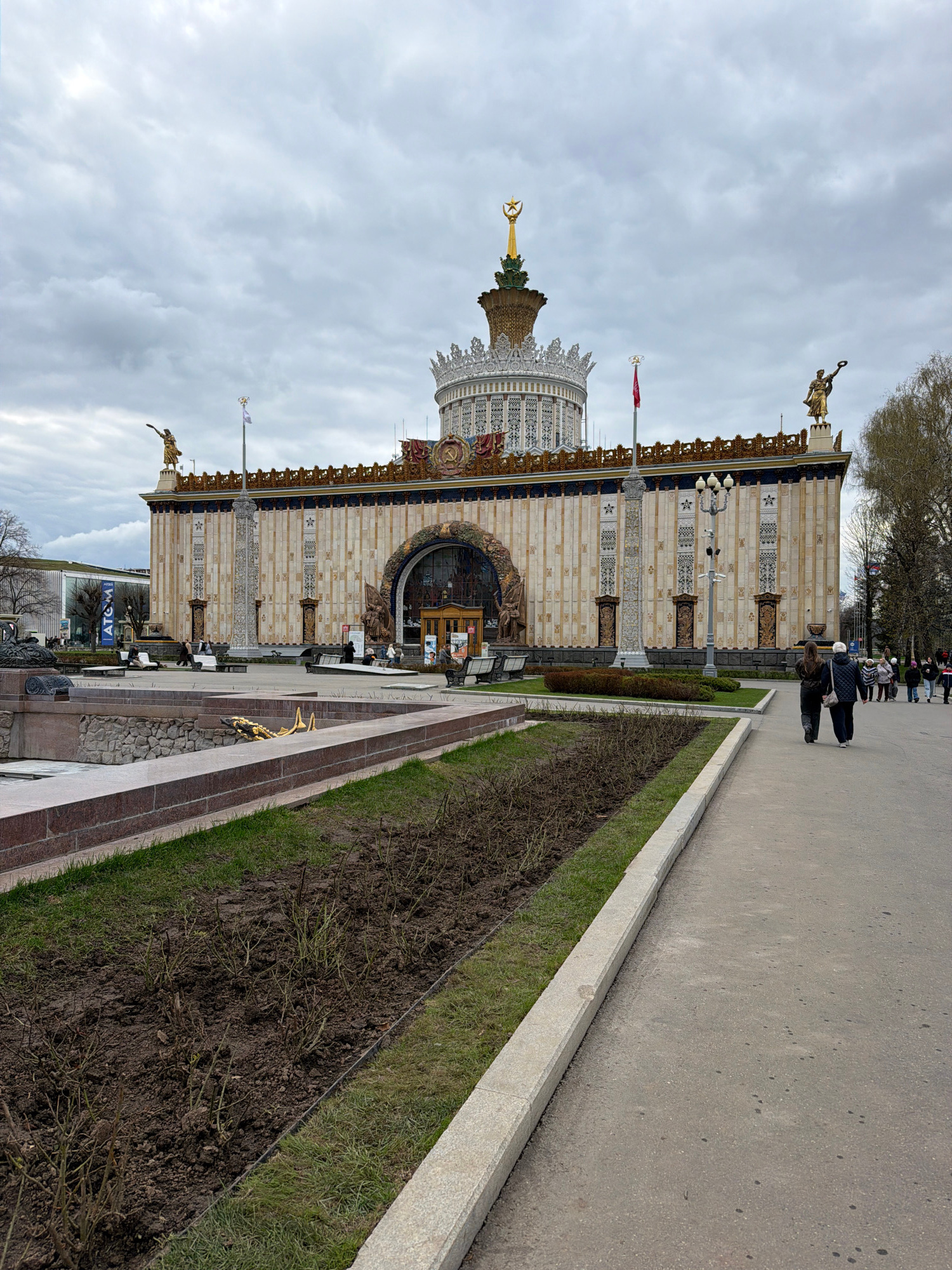 This image captures a grand, ornate building, likely a pavilion at an exhibition center in Moscow, under an overcast sky. The architecture is characterized by its Stalinist Empire style, featuring a m…read more