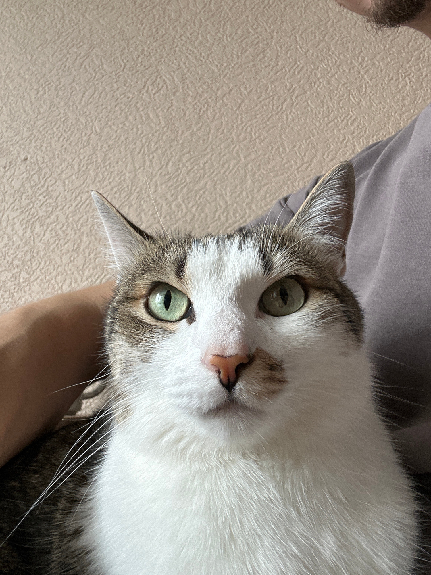 The image is a close-up, slightly angled view of a domestic cat being held. The cat has white fur mixed with patches of brown and grey. It has green eyes, and its nose appears pink. Long white whiskerβ¦read more