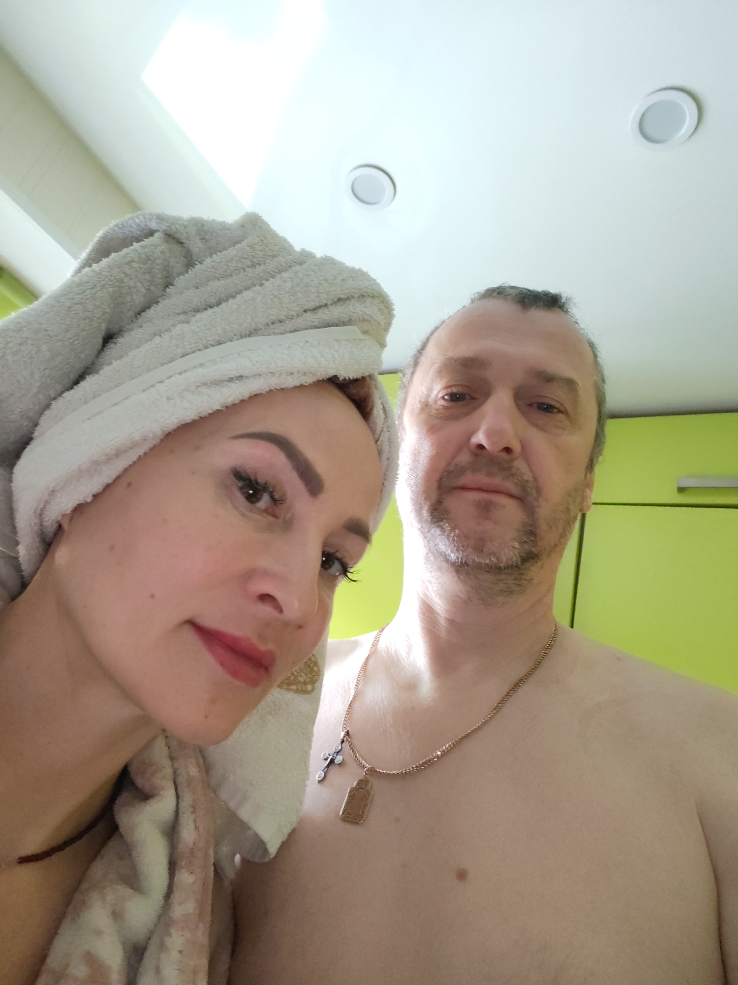 The image depicts a selfie taken indoors, possibly in a bathroom or kitchen, as indicated by the white ceiling lights and light green cabinets. Two individuals are visible: a woman on the left, with a…read more
