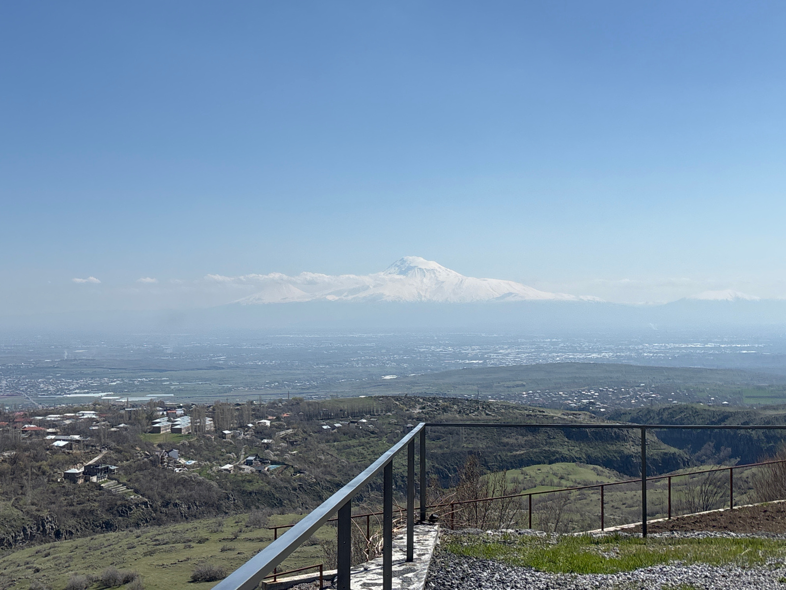 This panoramic photograph, taken from Orgov, Armenia, showcases a vast and impressive landscape under a clear blue sky. The most dominant feature is the majestic, snow-capped Mount Ararat, appearing a…read more