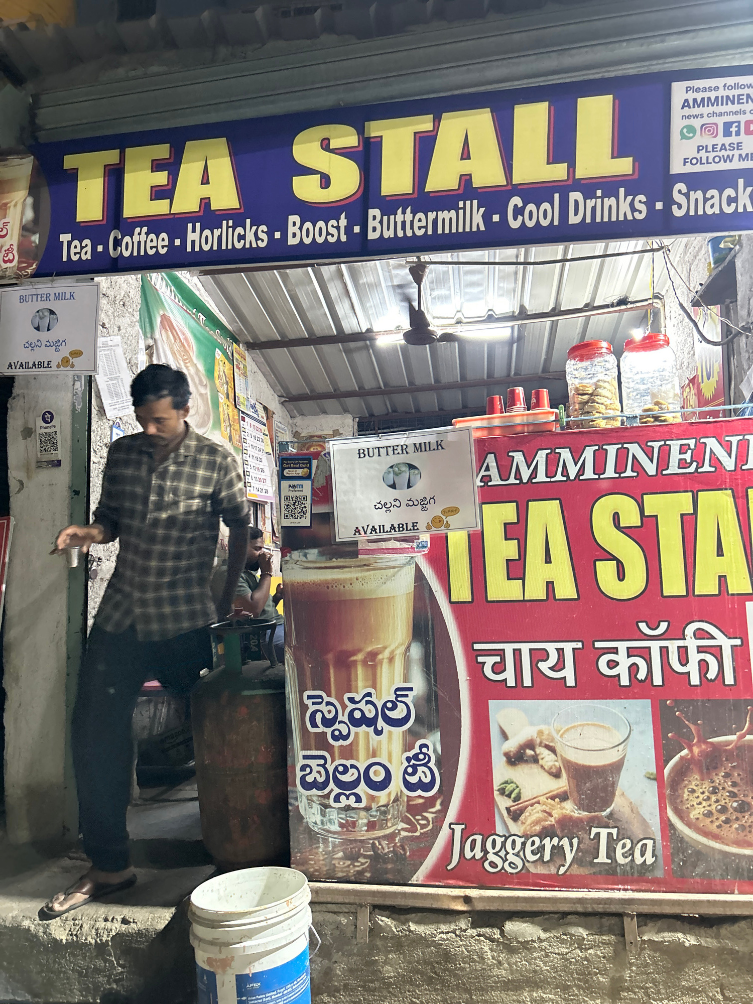 The image shows an outdoor tea stall in Puttaparthi, India. The stall is identified by a blue sign reading "TEA STALL", listing tea, coffee, Horlicks, Boost, buttermilk, cool drinks, and snacks. A redβ¦read more