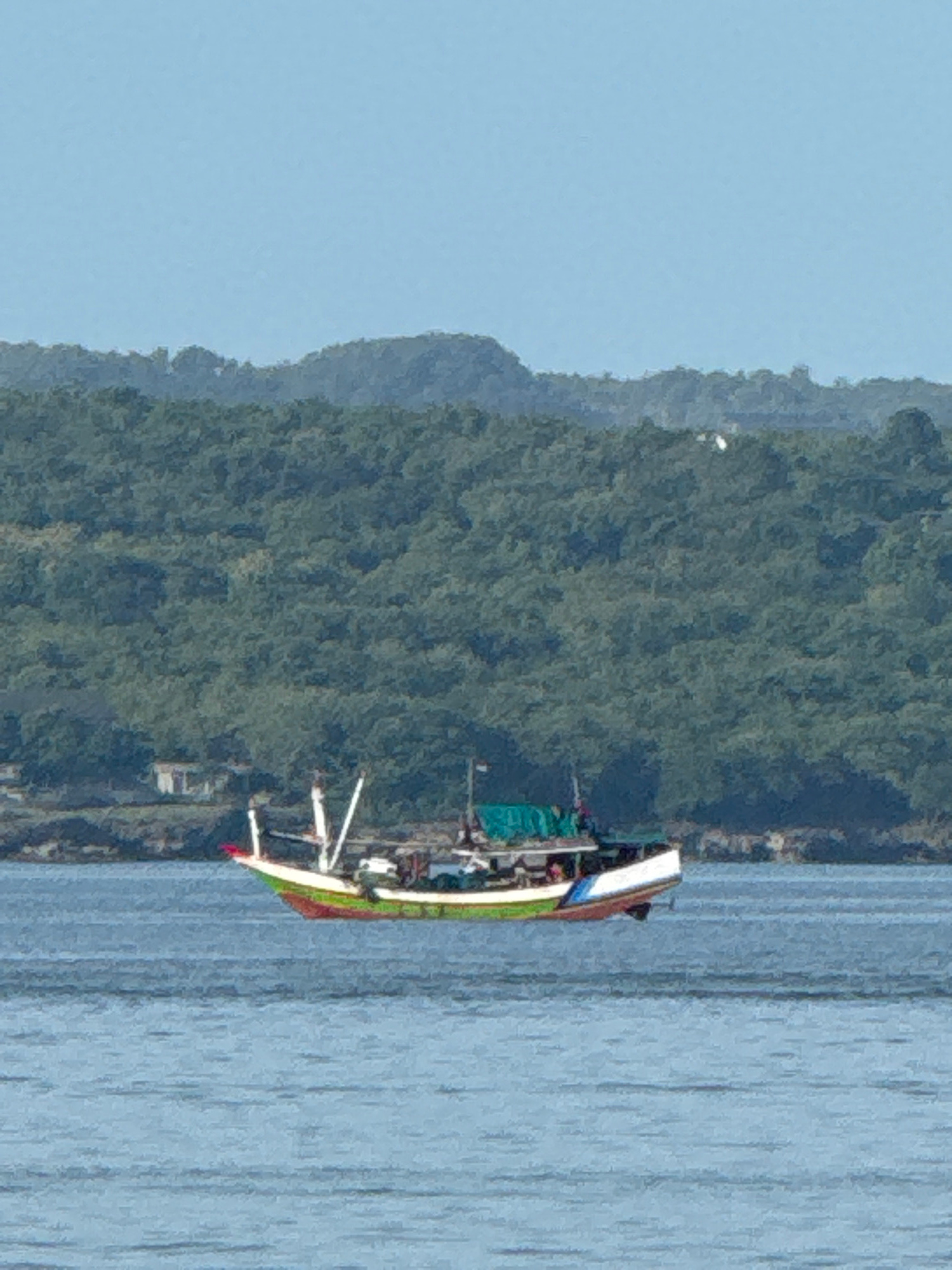 A boat is sailing on the water with land on the background. The location is likely near Denpasar, Indonesia, given the tropical vegetation visible.