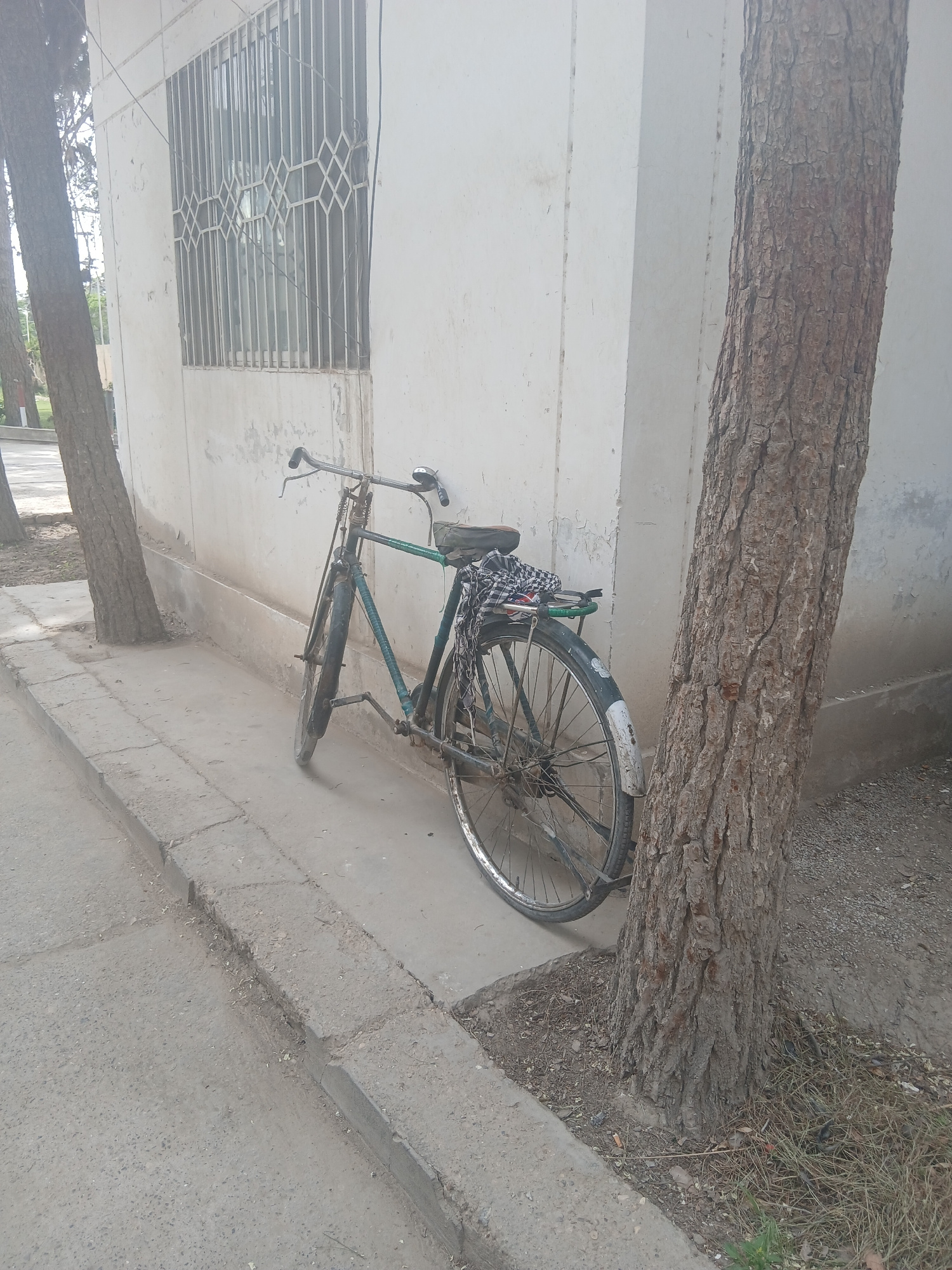 A green bicycle leans against a light-colored wall beneath the thick trunk of a tree. The surrounding ground is paved with concrete. A barred window is visible on the wall. The location appears to be…read more
