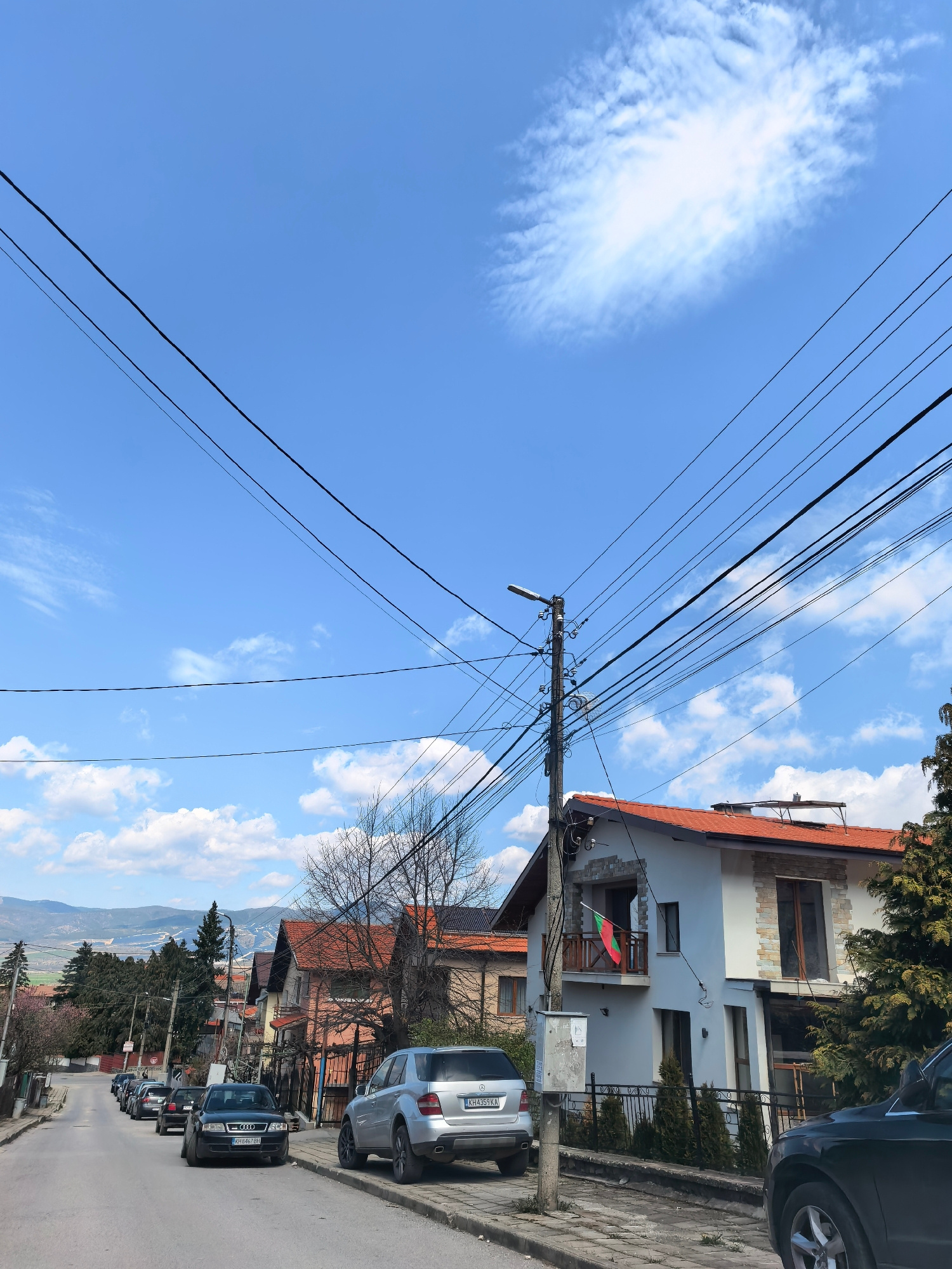 The image depicts a residential street in an urban area. A row of parked cars lines the left side of the street, including several dark-colored sedans and an Audi with the license plate "KH8467DI". On…read more