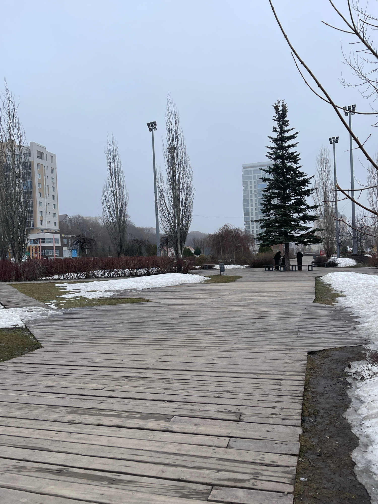 The image shows a public space in Kazan, Russia, featuring a wooden boardwalk bordered by melting snow and bare vegetation, indicative of early spring. The boardwalk is made of closely spaced wooden p…read more