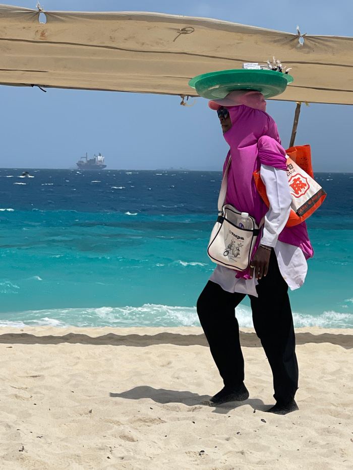 An individual walks rightward on a light sandy beach in Zanzibar, Tanzania, beneath a partial beige fabric canopy. The person wears a magenta full-body covering over a white long-sleeved shirt, black…read more