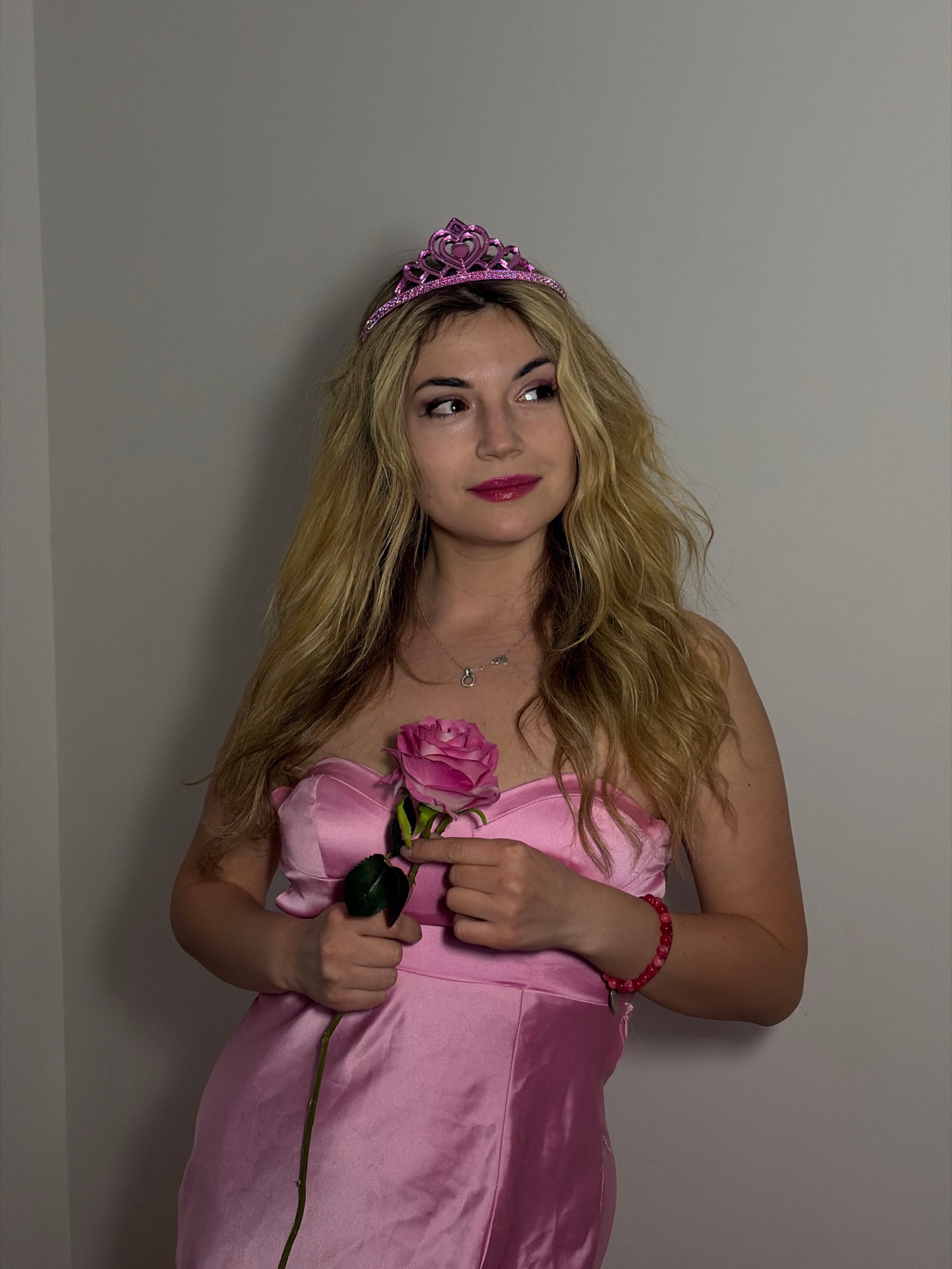 A light-skinned female wearing a pink dress and a pink tiara is holding a pink rose. She is also wearing a pink bracelet on her right wrist and a necklace with a silver pendant. The environment is a s…read more