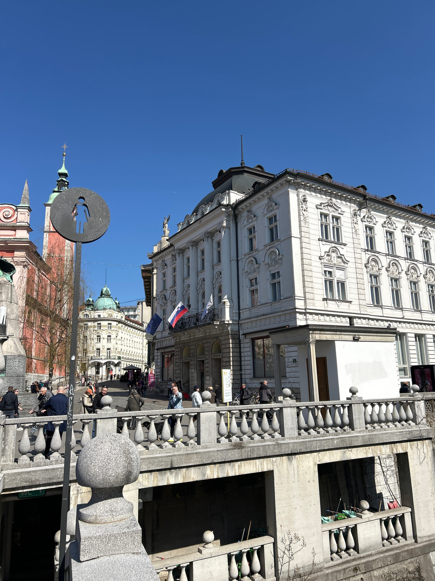 The image captures a bustling pedestrian scene on a clear, sunny day at Prešeren Square, looking towards the Triple Bridge (Tromostovje) in Ljubljana, Slovenia. In the immediate foreground, a gray co…read more