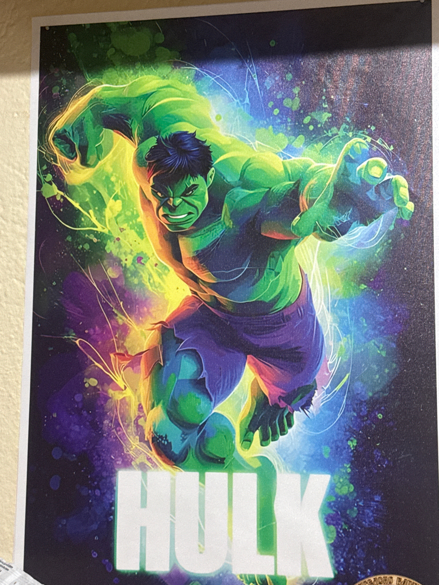 A framed poster of the Hulk is displayed. The Hulk is rendered in shades of green, purple, yellow, and white against a backdrop of splashes and streaks of the same colors. The word "HULK" is printed v…read more