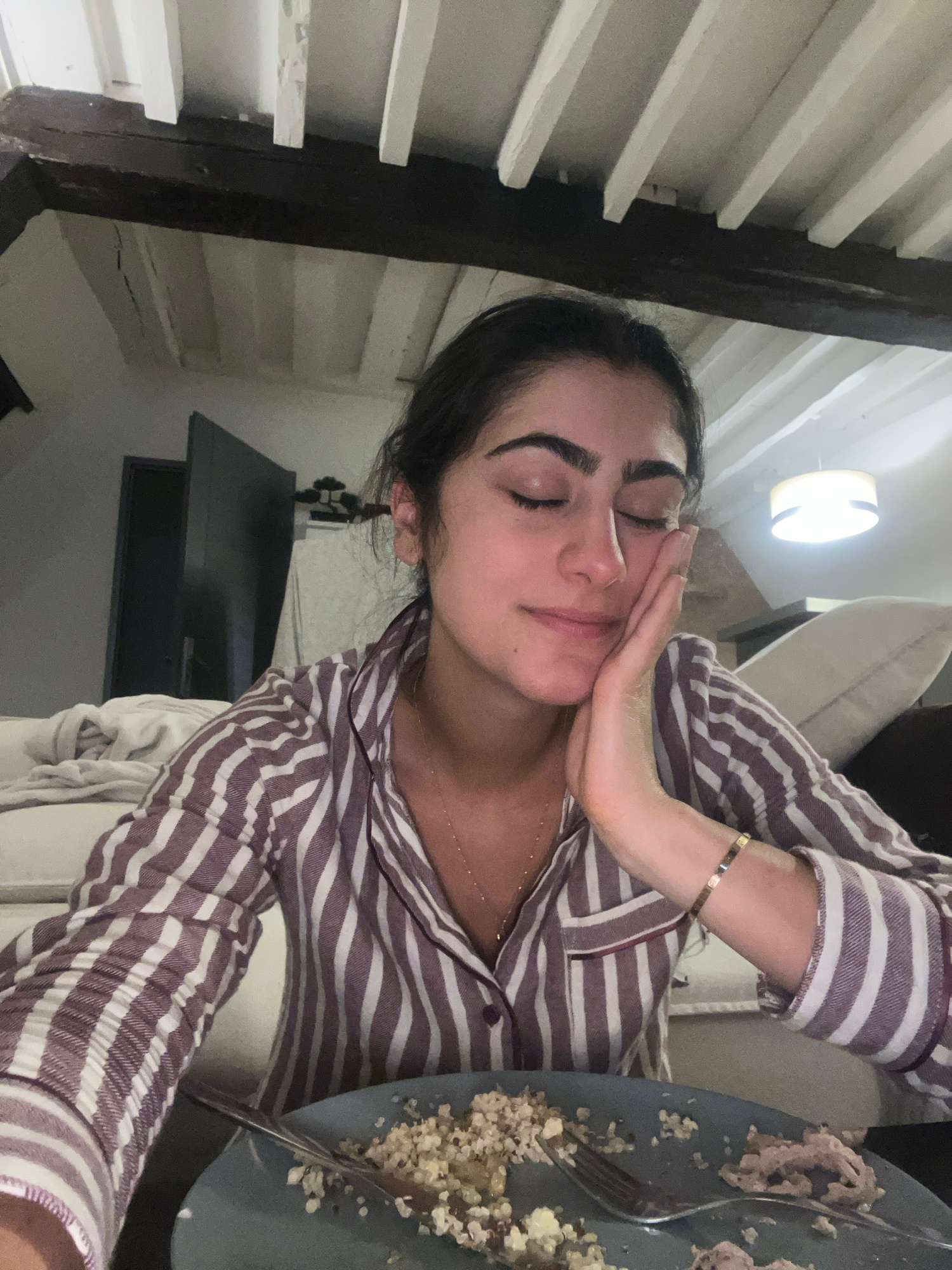 A woman with dark hair is lying on a white couch, her eyes closed, with her right hand touching her cheek. She is wearing a purple and white striped long-sleeved shirt and a gold bracelet. There is a…read more