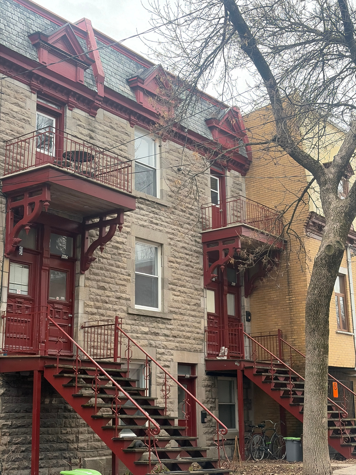 This image captures a multi-story residential building, likely an apartment complex or townhouses, characterized by its distinctive red external staircases and balconies, a common architectural featur…read more