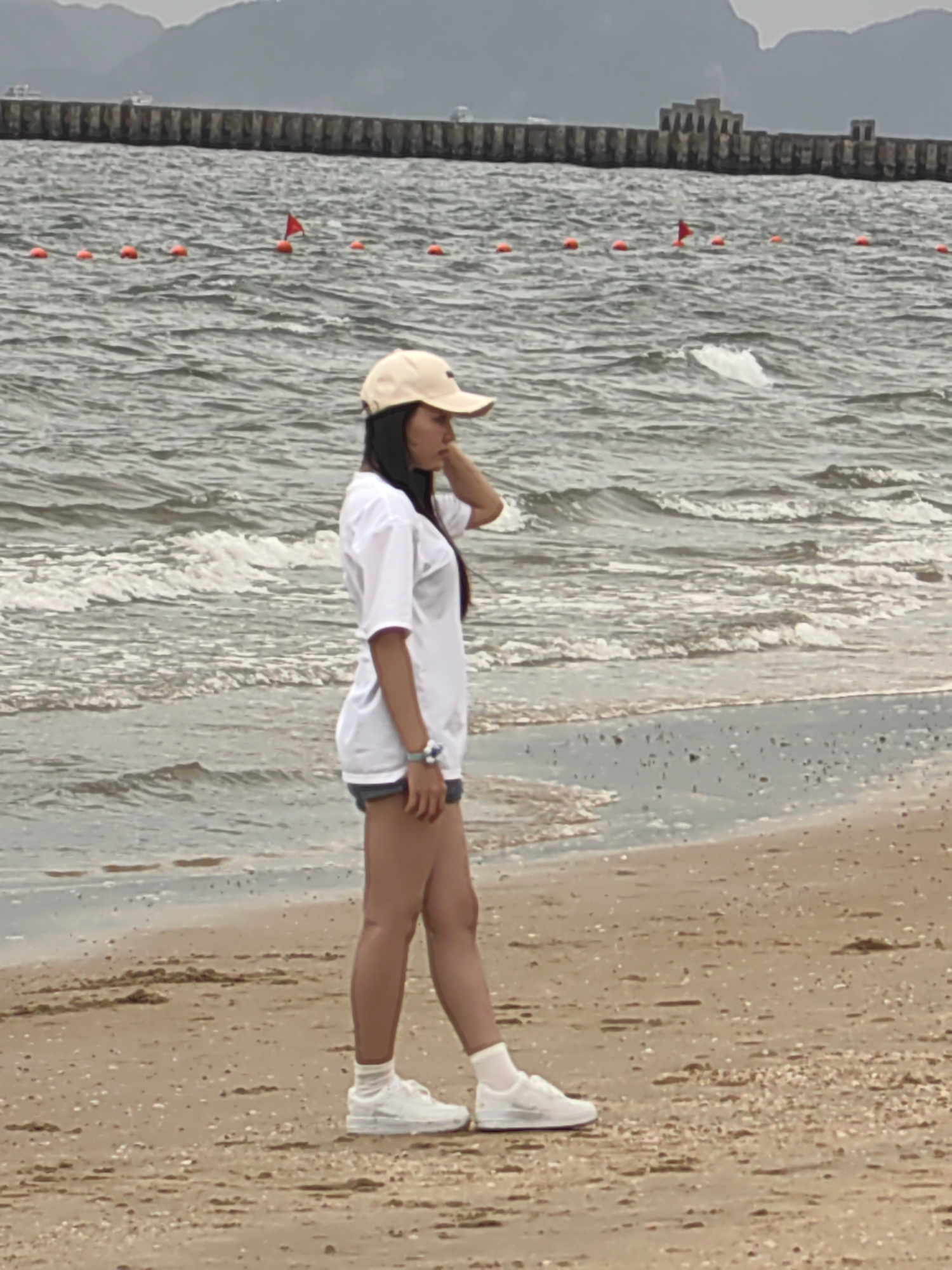The image depicts a person standing on a beach in Bai Chay Ward, Vietnam. The person is wearing a beige baseball cap, a white t-shirt, denim shorts, white socks, and white sneakers. They are facing to…read more