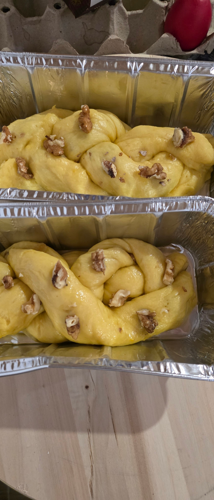The image shows two aluminum foil containers, each containing a braided, yellow bread topped with walnuts. To the left of the containers, partially visible, is a cardboard egg carton with a single red…read more