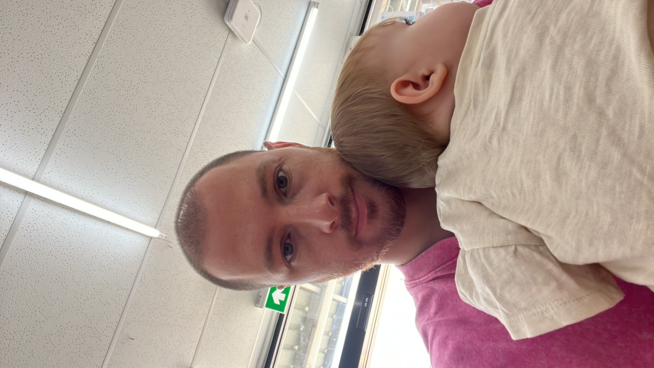 The image captures a man holding a baby or toddler in what appears to be an aisle of a store, likely a convenience store or pharmacy, given the products on display. The scene is set indoors, under bri…read more
