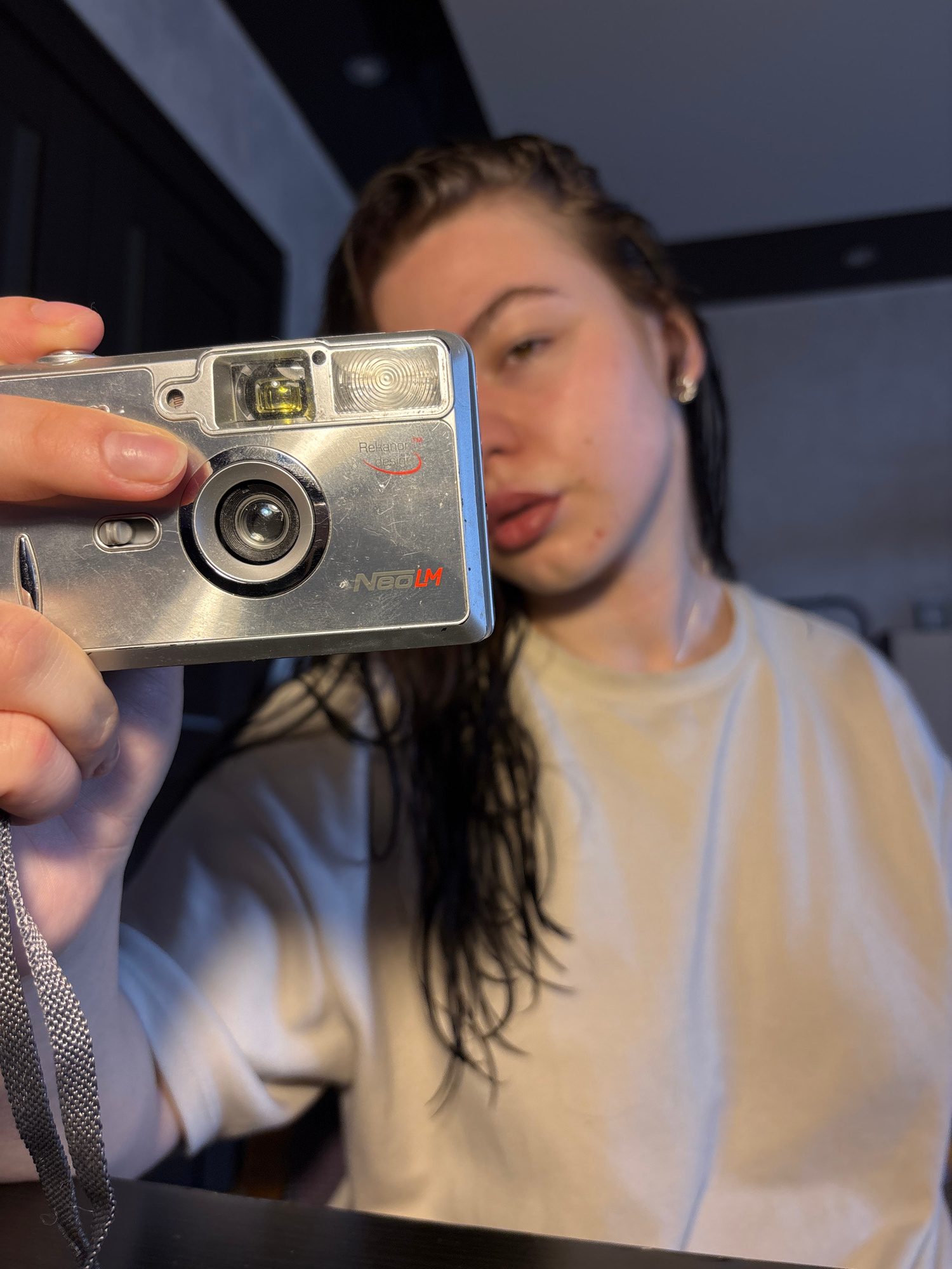 A woman holds a silver NeoLM camera in front of her face, presumably taking a selfie. She wears a white t-shirt. Her long dark hair is visible. The background is blurred, suggesting an indoor location…read more
