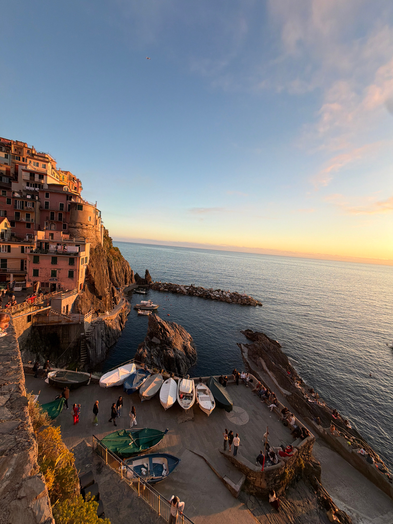 The image depicts a coastal scene in Manarola, Italy. It captures a series of colorful buildings stacked along the rocky coastline. The sea is visible, stretching to the horizon with a sky above thatβ¦read more