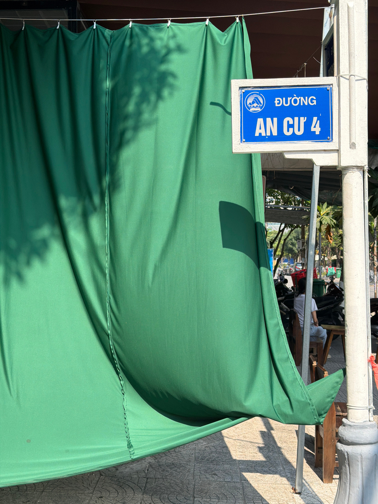 The image depicts a blue and white sign indicating "ĐƯỜNG AN CƯ 4" (An Cu 4 Road) in Đà Nẵng, Vietnam. A large, green canvas or awning is draped in the foreground. The sign is mounted on a white struc…read more