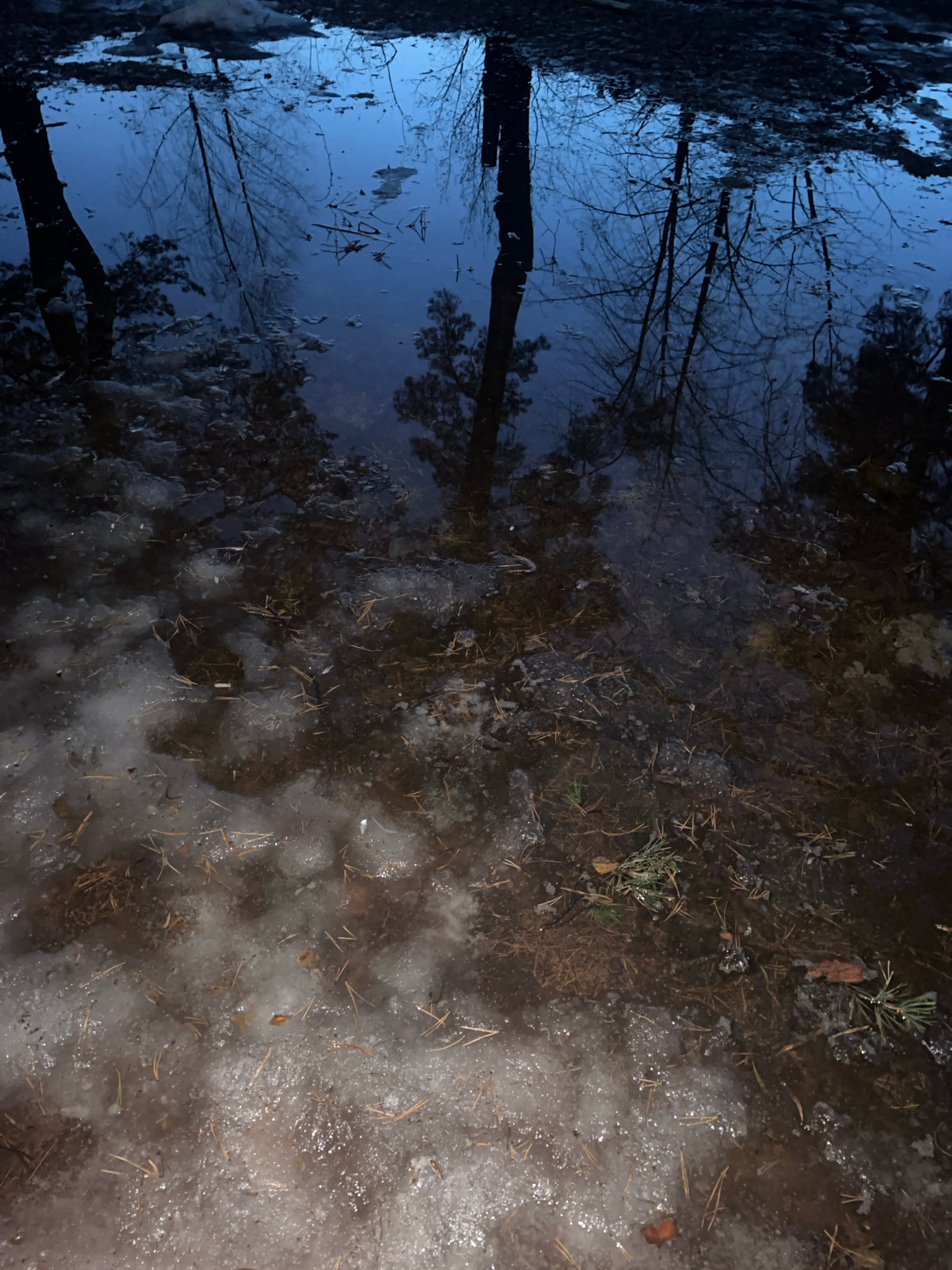 The image shows a waterlogged area in Chaikovsky, Russia, reflecting bare trees under a twilight sky. The ground is covered with a mixture of mud, ice, pine needles, and sparse vegetation. There are n…read more