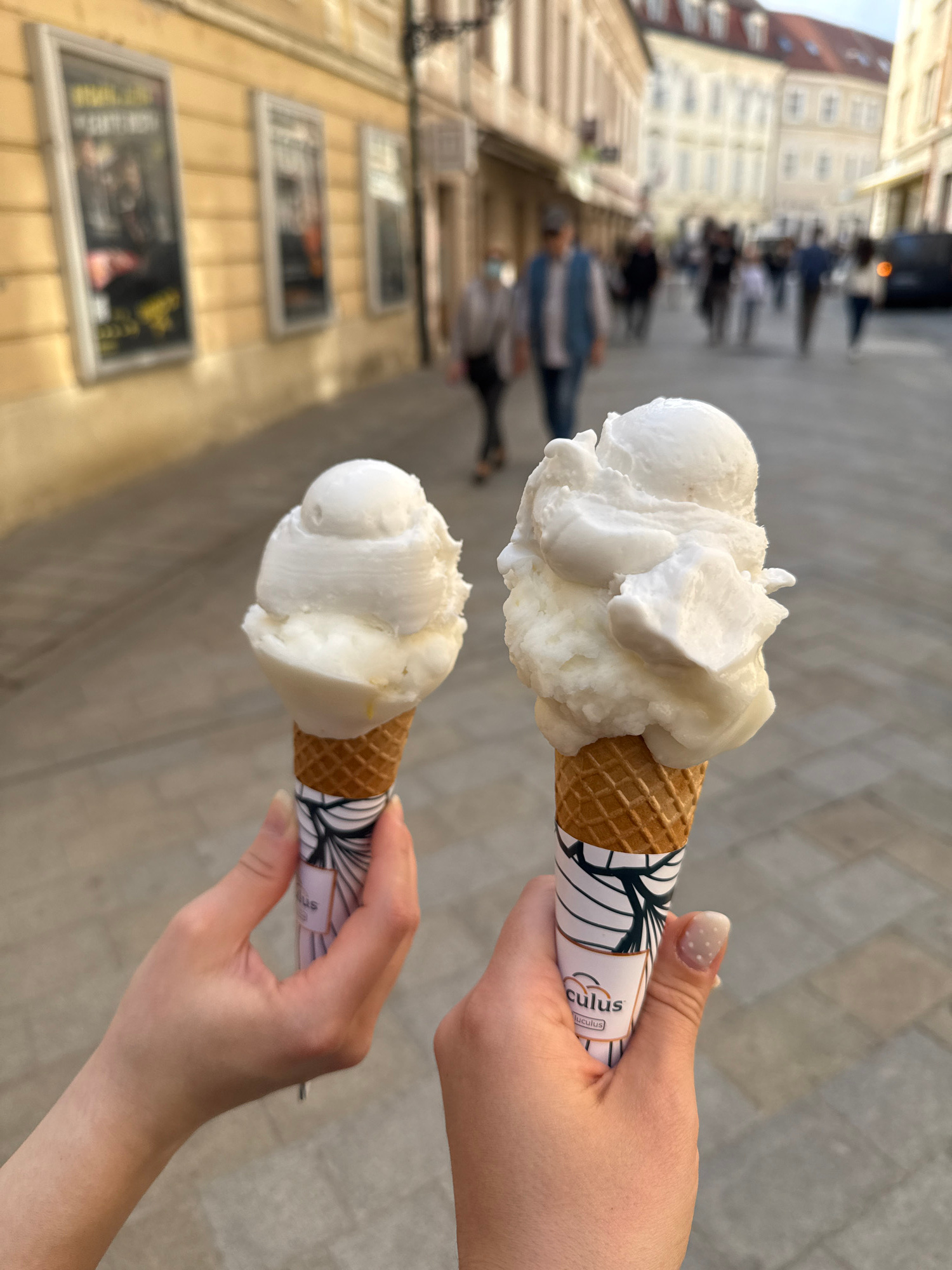 Two hands hold two white gelato or ice cream cones against a blurred outdoor city street background. The ice cream appears to be a light, possibly white or very pale yellow, flavor, piled generously o…read more