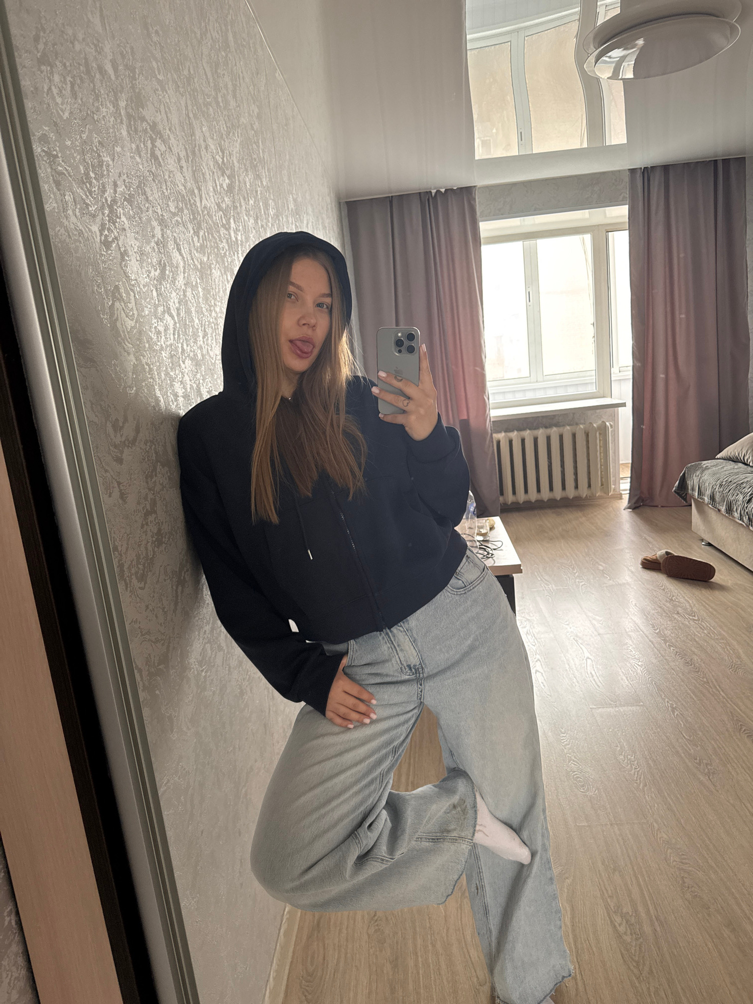 A woman is taking a selfie in a room. The woman is wearing a black hooded sweatshirt and light-wash jeans. She is sticking her tongue out. The room has beige walls and floors. A bed, window, and radia…read more