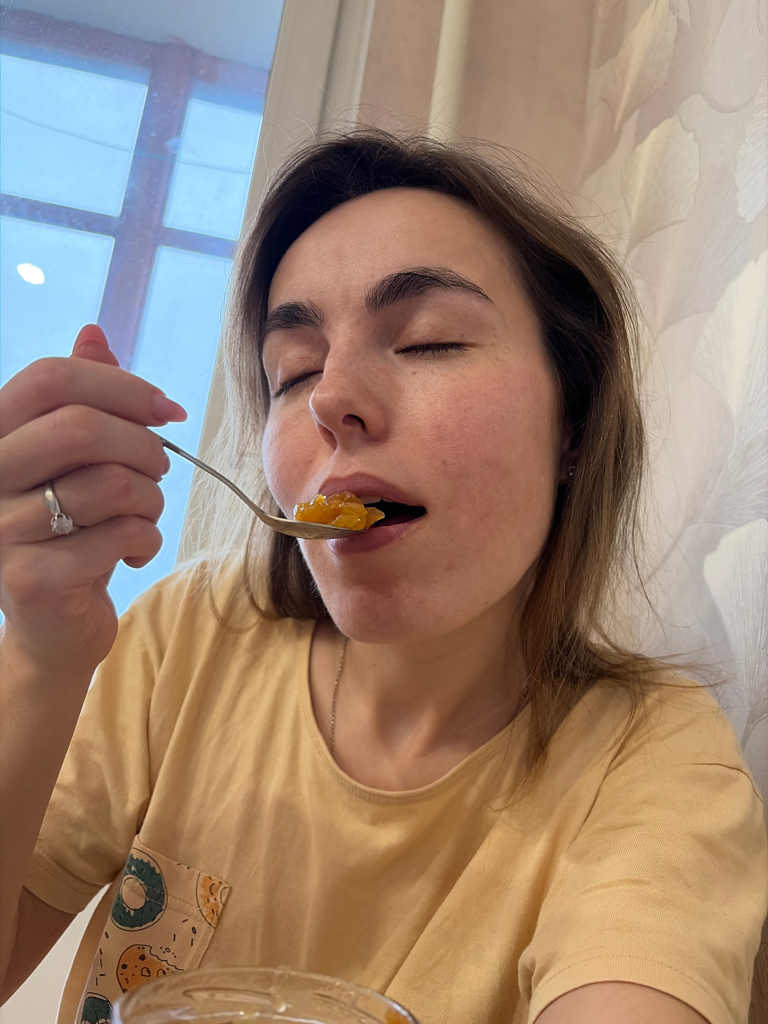 A woman is holding a fork with a piece of yellow food in her mouth. Her eyes are closed. She has brown hair. She is wearing a yellow shirt. She has a ring on her finger. A window is in the background.…read more