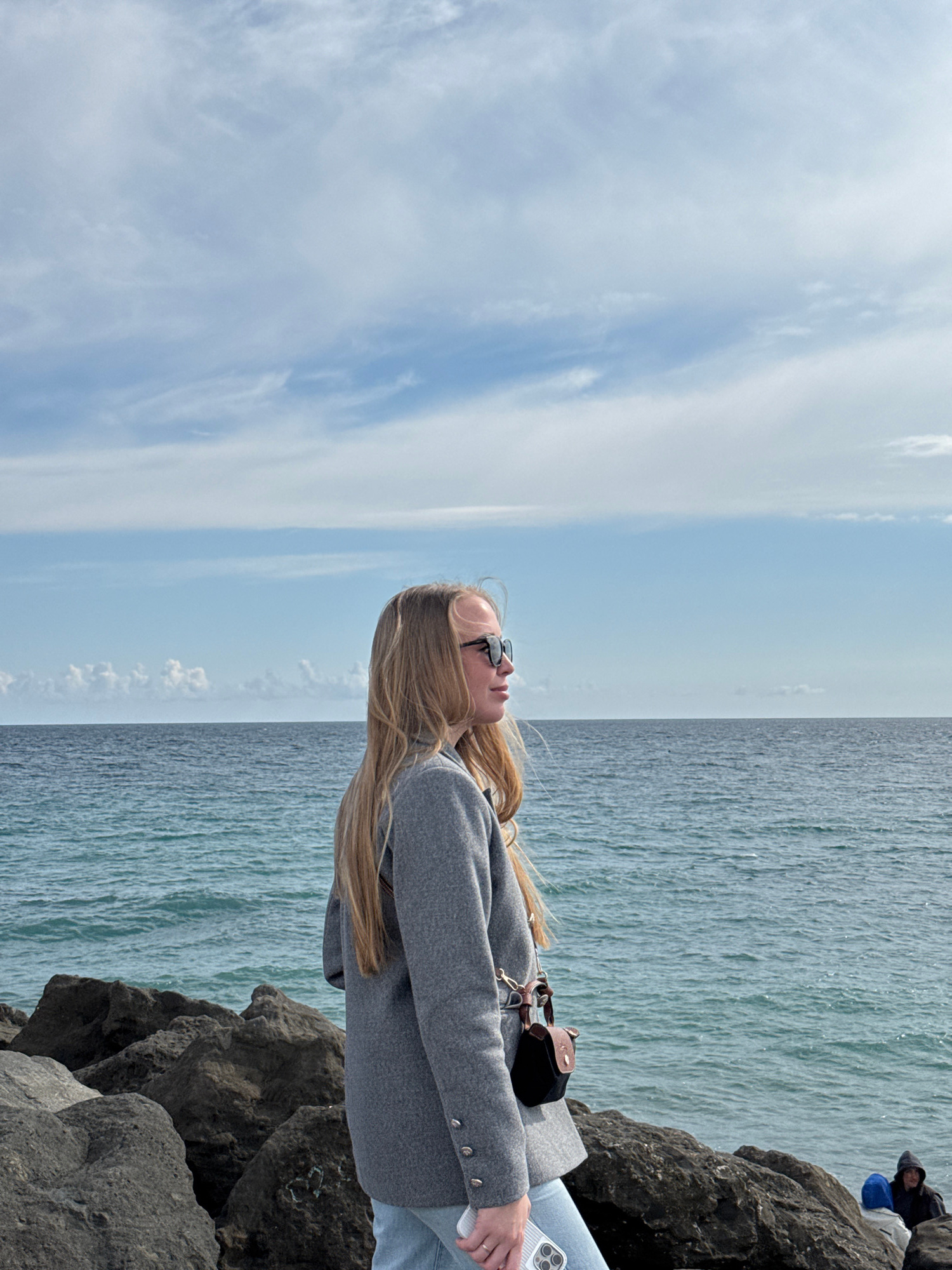 A young woman is sitting on dark gray rocks near the ocean in Sirius, Russia. The ocean stretches to the horizon with a light-blue, cloudy sky above. The woman has long blonde hair and is wearing sung…read more