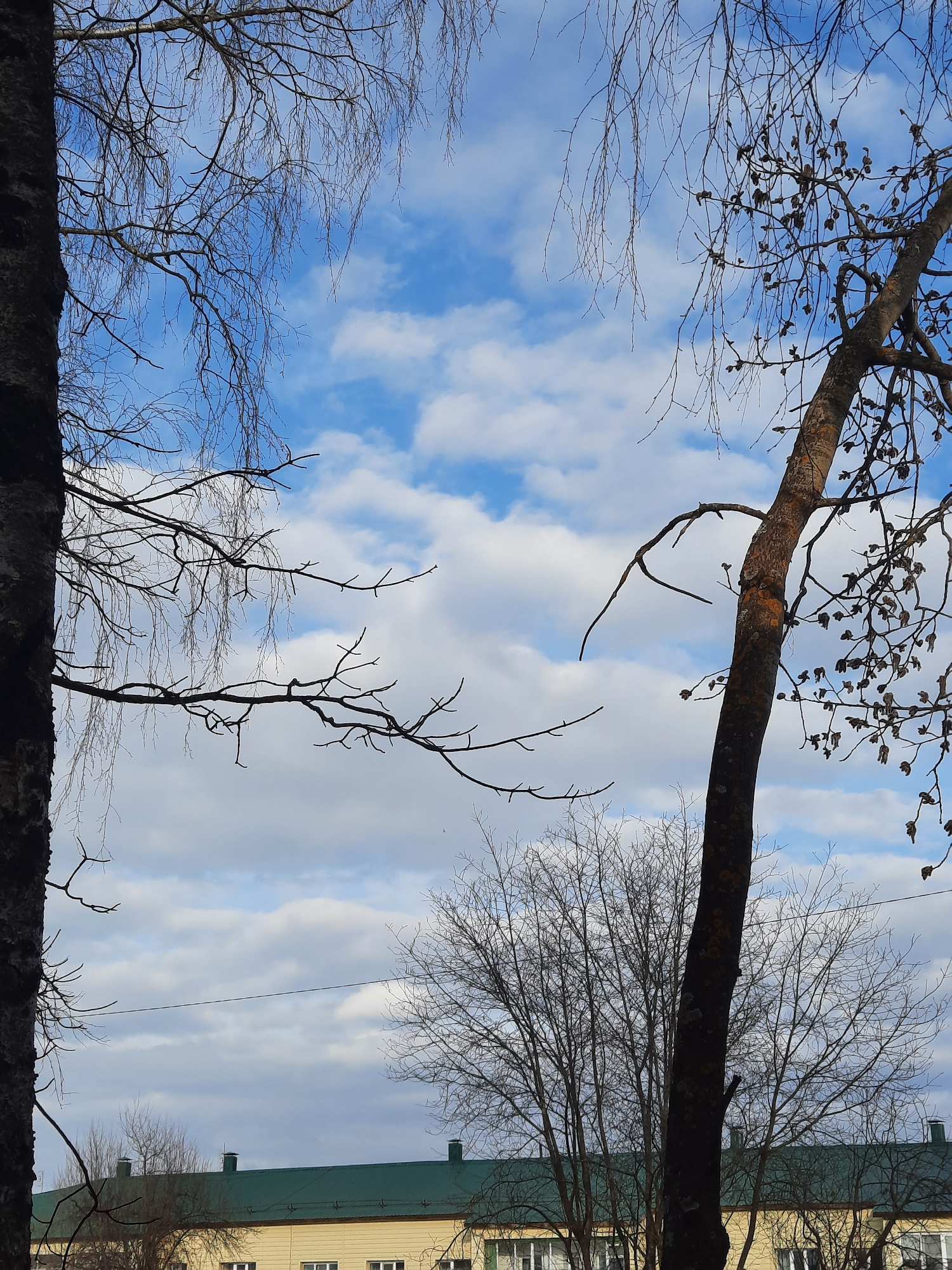 The image is taken from a low angle, looking up at a cloudy blue sky framed by bare tree branches. A building is partially visible on the right side of the frame, with a green roof and beige walls. In…read more