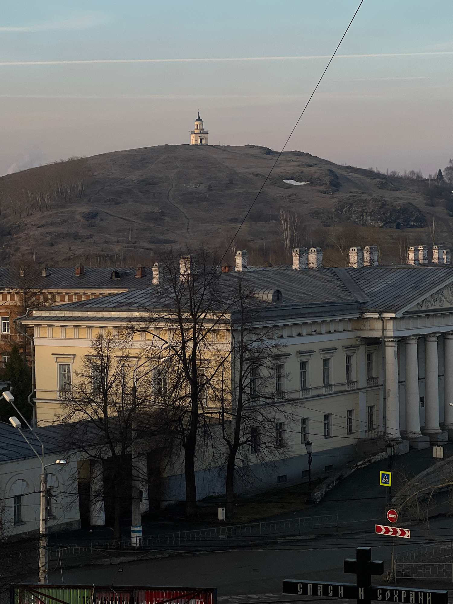 The image shows a view of Nizhny Tagil, Russia. In the foreground, there's a multi-story building with a light yellow facade and a grey roof. Bare tree branches obscure parts of the building. Street s…read more