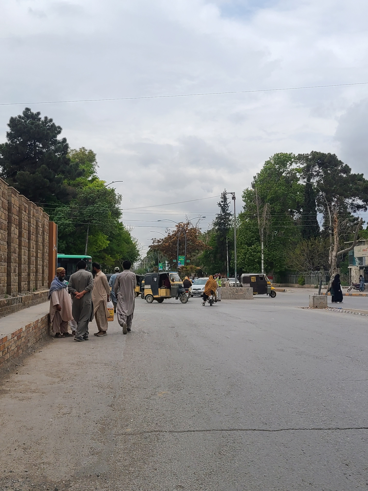 The image depicts a street scene in Quetta City Tehsil, Pakistan. On the right side of the image is a large paved street, slightly angled upwards to the right. Several auto-rickshaws, a common mode of…read more