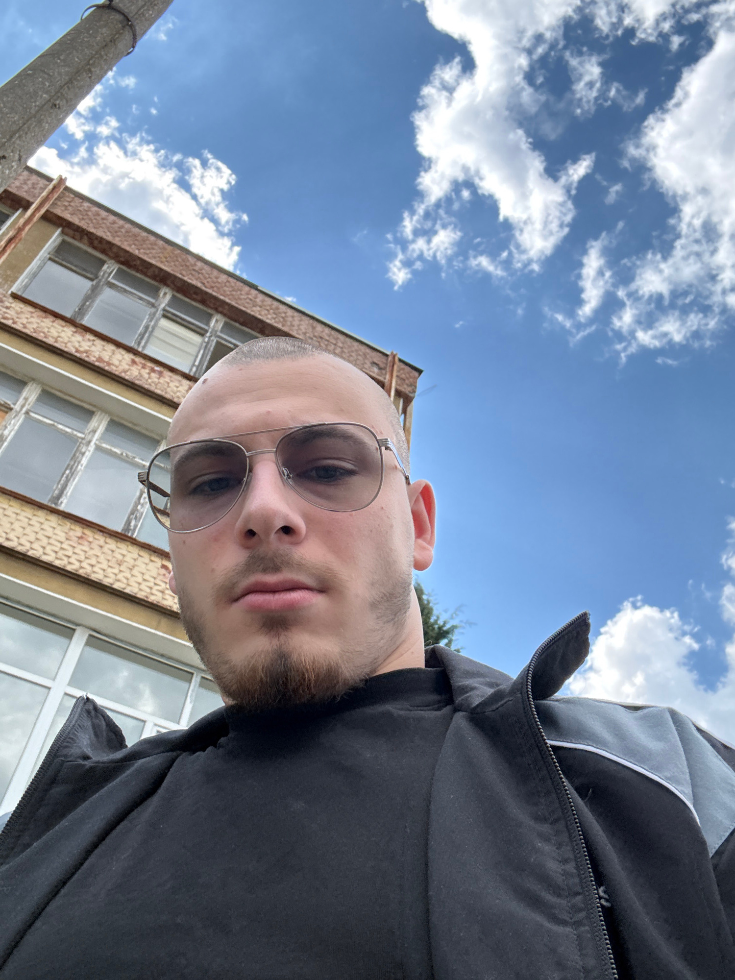 A selfie captures a man with short, light-colored hair and a stubble beard, wearing sunglasses and a black jacket. He is positioned at an angle, looking down into the camera. Behind him is a building…read more