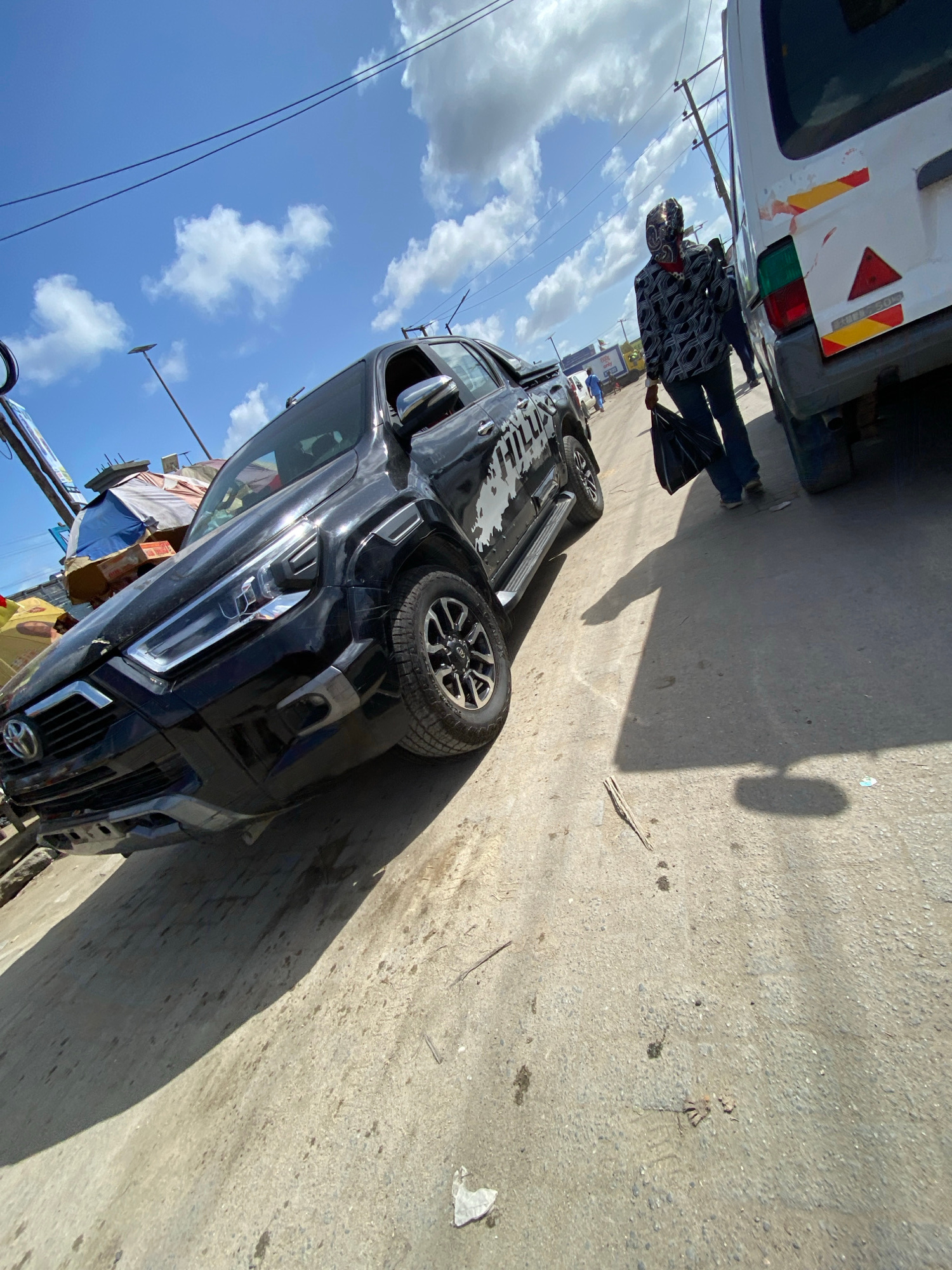A man walks by a black Toyota Hilux parked on a street in Lekki, Nigeria. A white van is parked nearby. Overhead power lines stretch across a blue sky with scattered clouds. A shadow is cast onto theβ¦read more