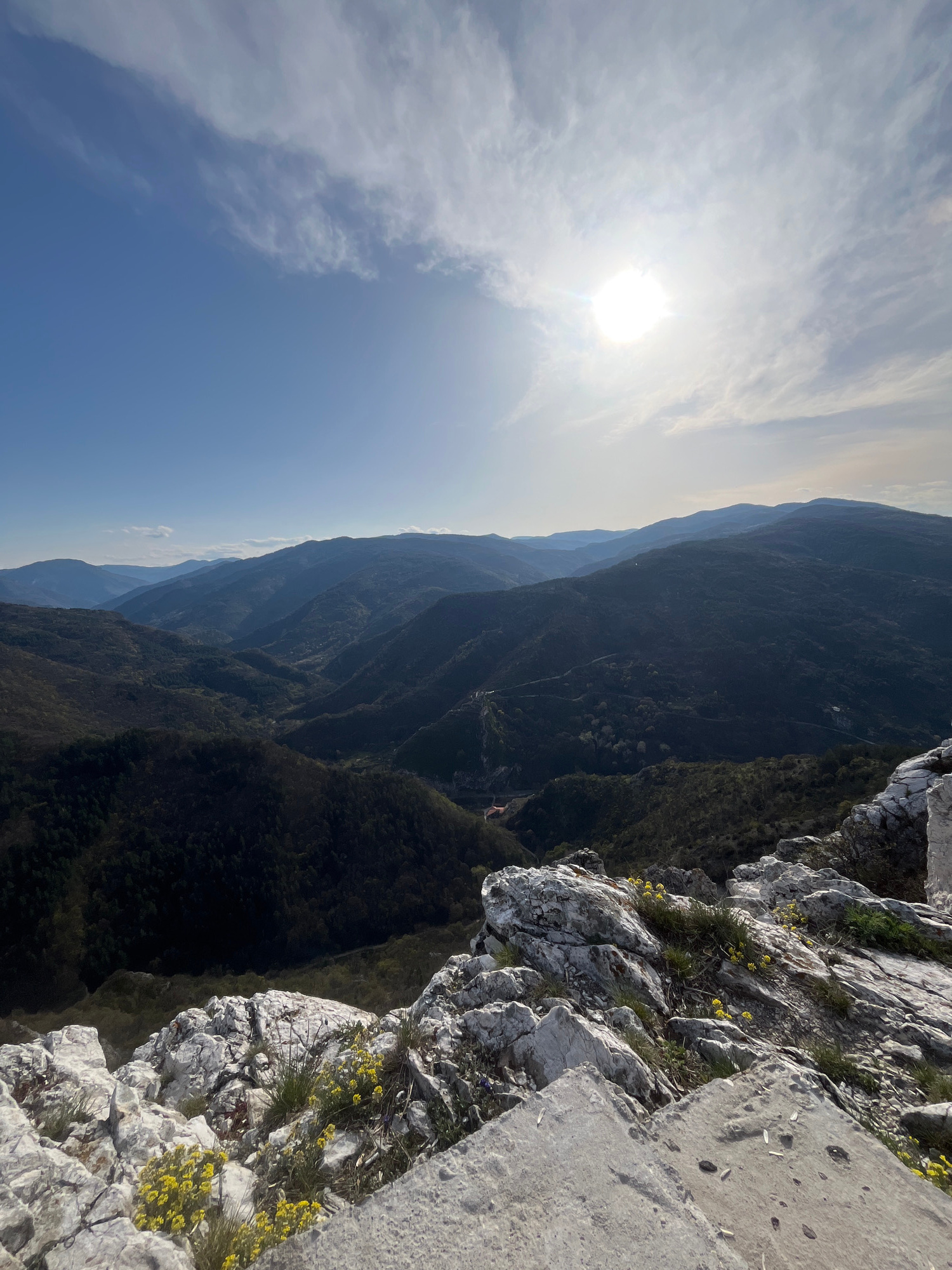 The image is a landscape photograph taken from a high vantage point, possibly a cliff or mountain edge. The foreground features rocky terrain with some vegetation, including small yellow flowers. A stβ¦read more