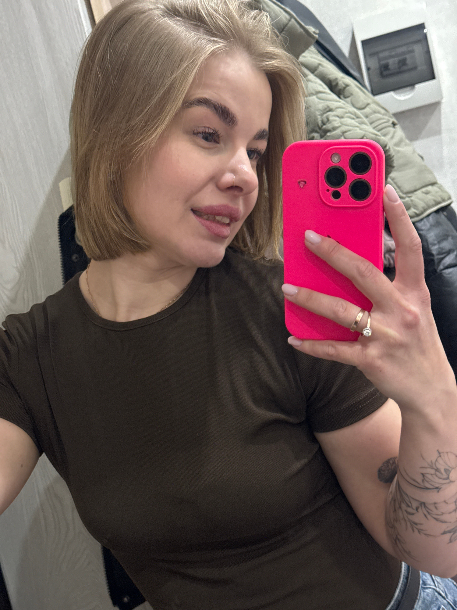 A person is holding a pink smartphone to take a selfie. The person has blonde hair, and the skin of their right arm shows a floral tattoo. They are wearing a brown t-shirt and a ring on the third fing…read more